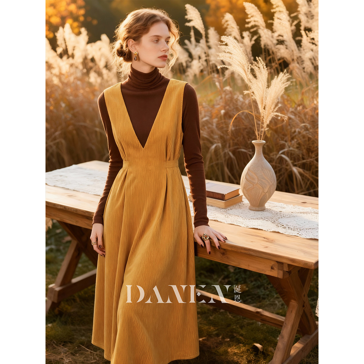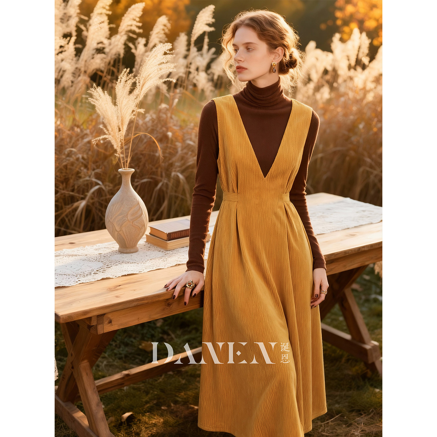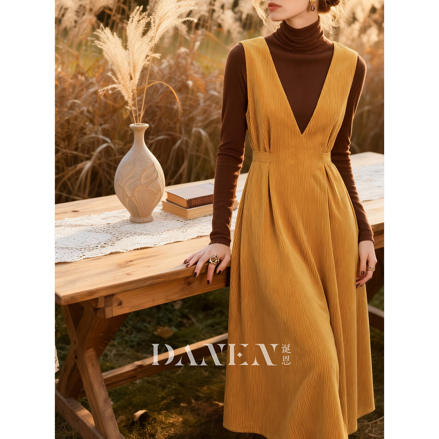 📚 姜黄色灯芯绒V领背带连衣裙女2026年秋冬新款时尚洋气叠穿长裙子