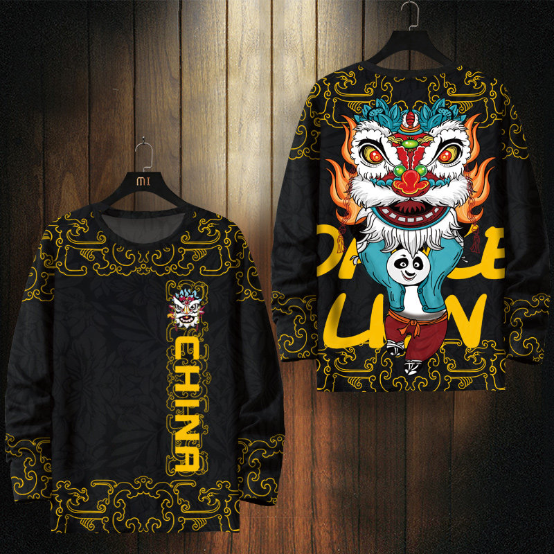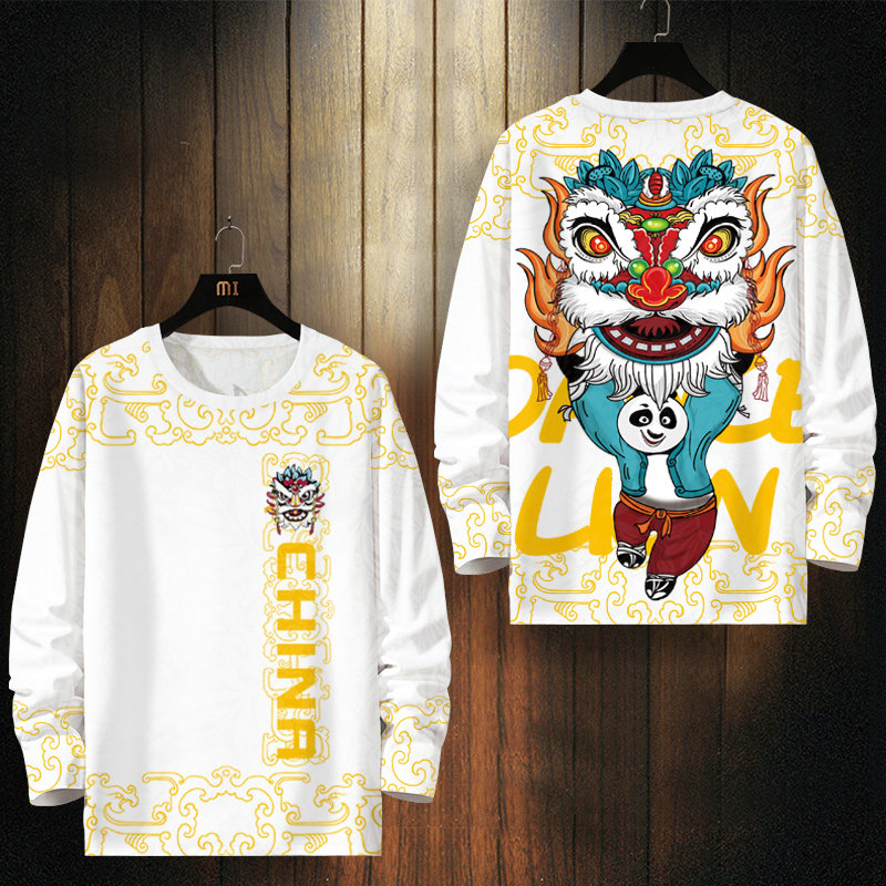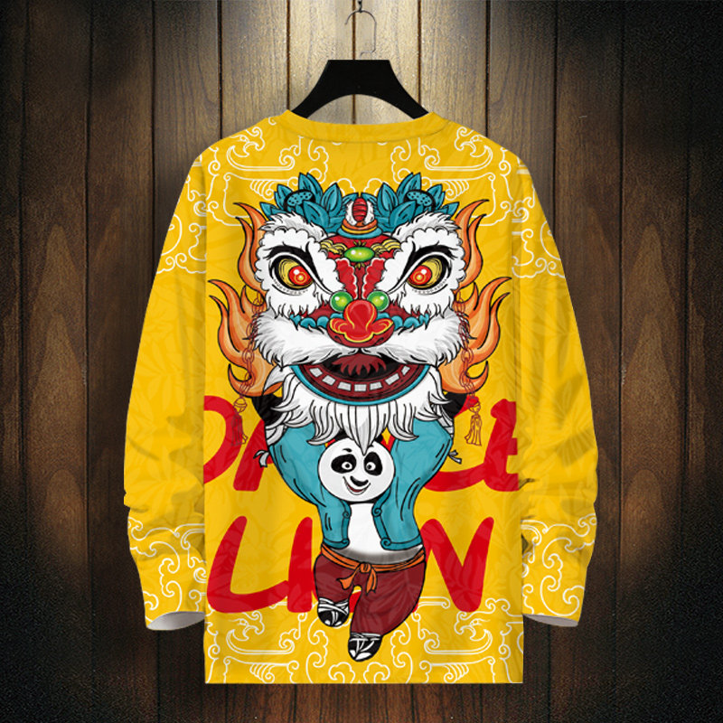 📚 熊猫长袖t恤男生秋季国潮醒狮圆领上衣修身大码青少年打底衫黄色