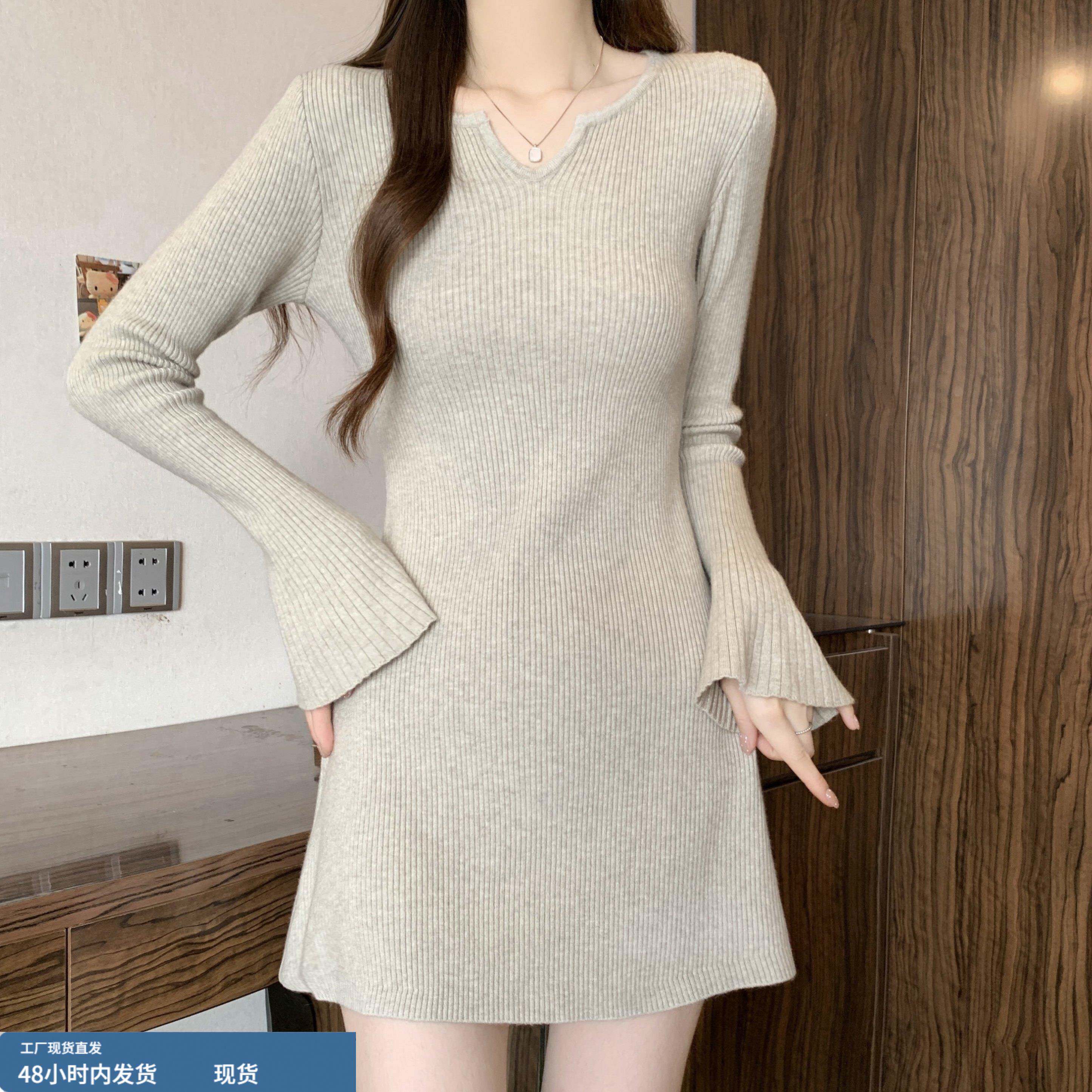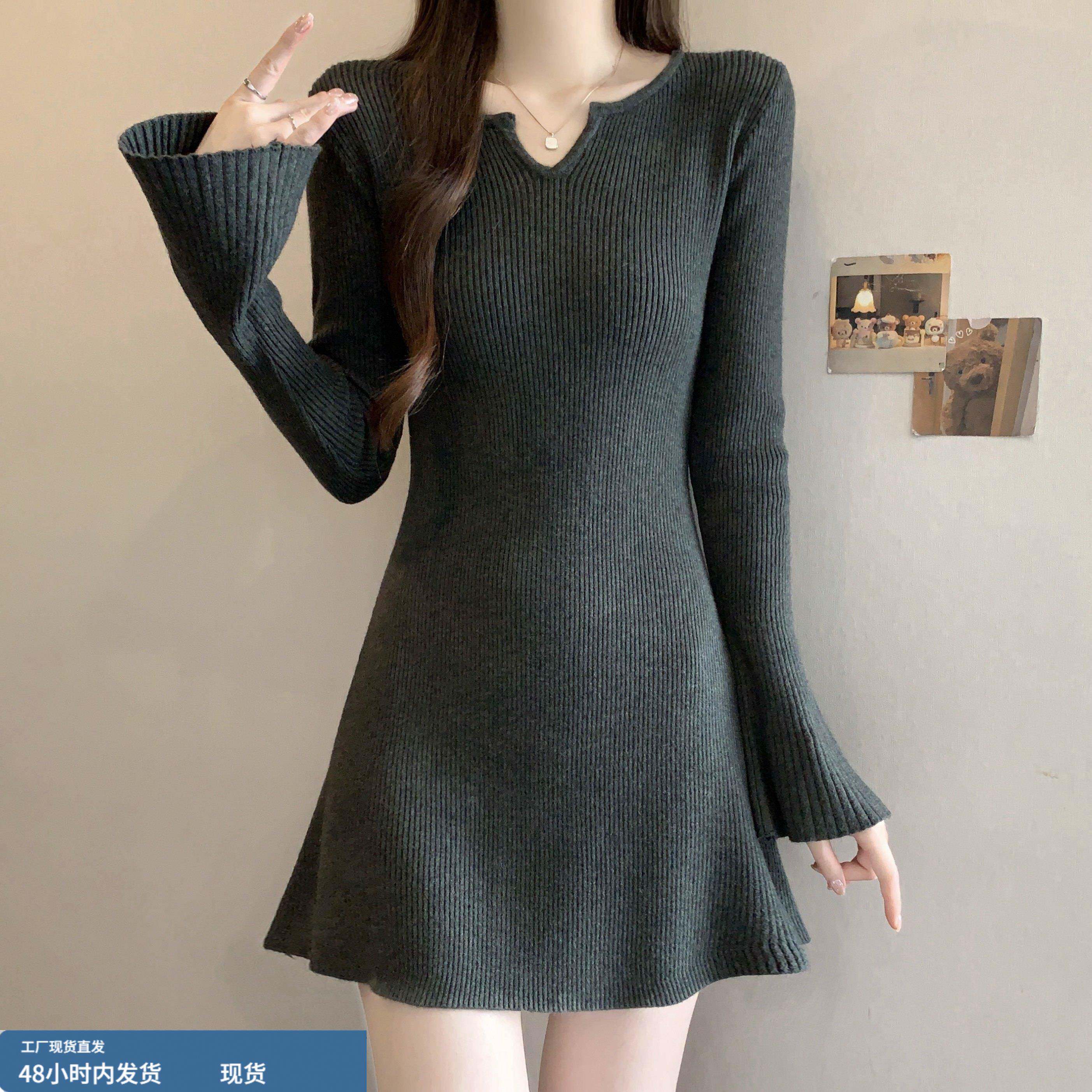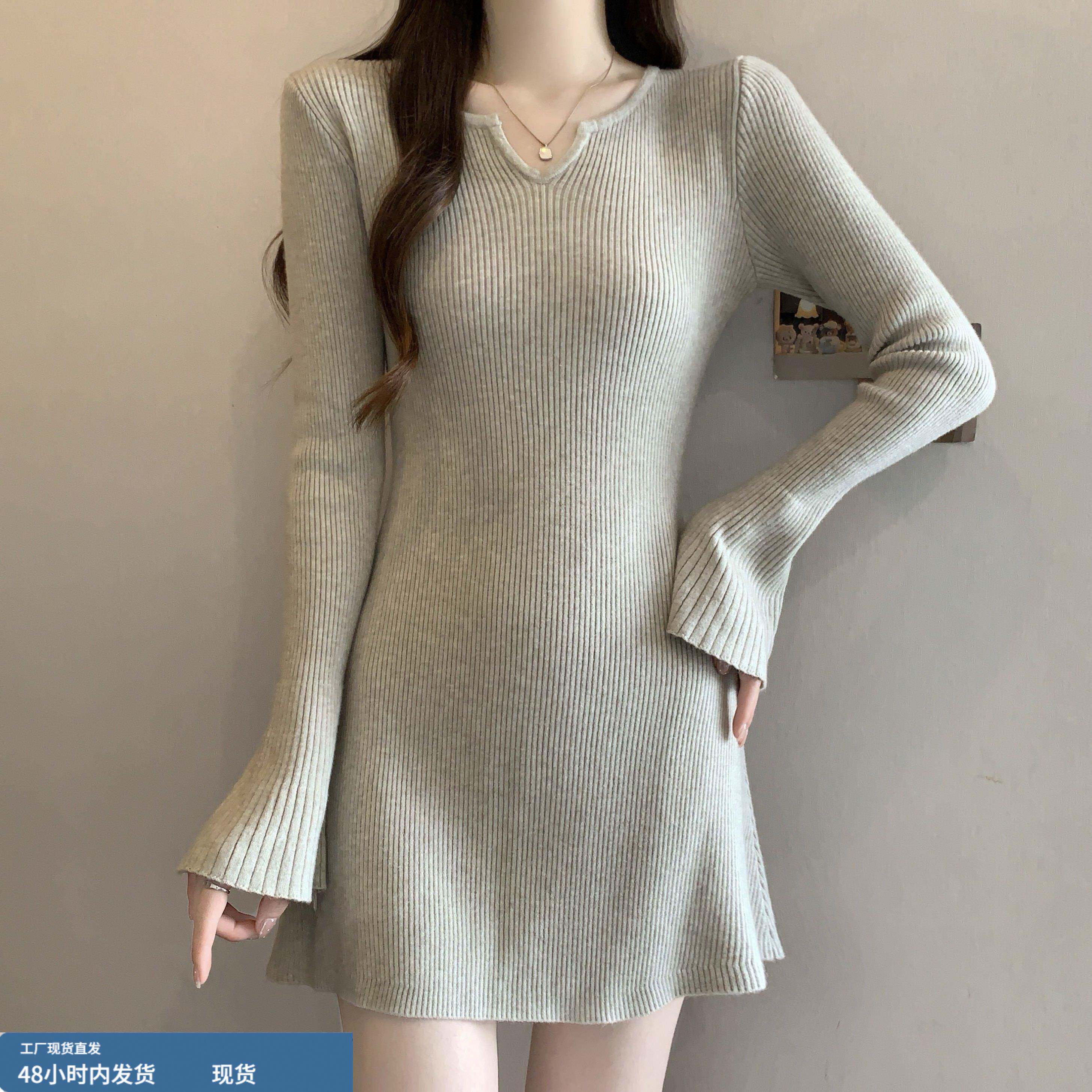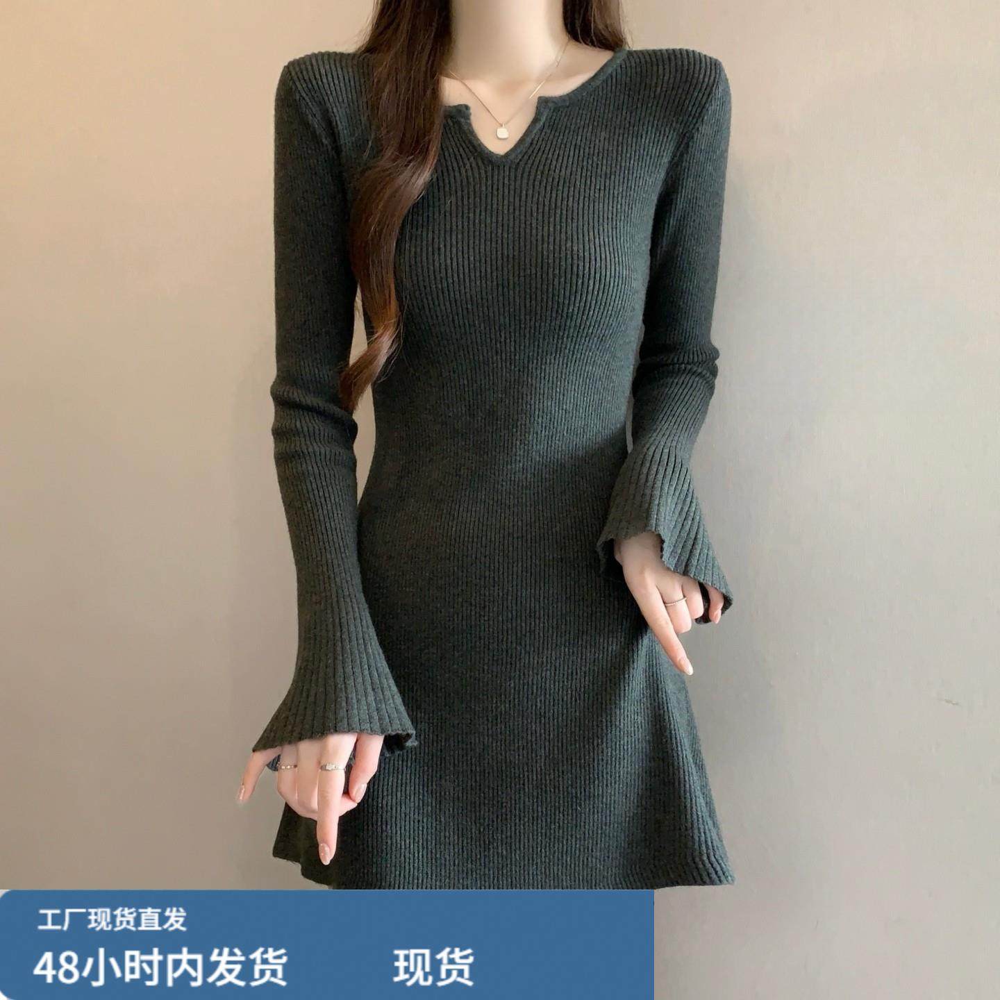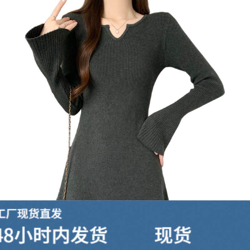 📚 V领打底针织连衣裙女秋冬新款大码胖mm显瘦收腰配大衣中长款裙子