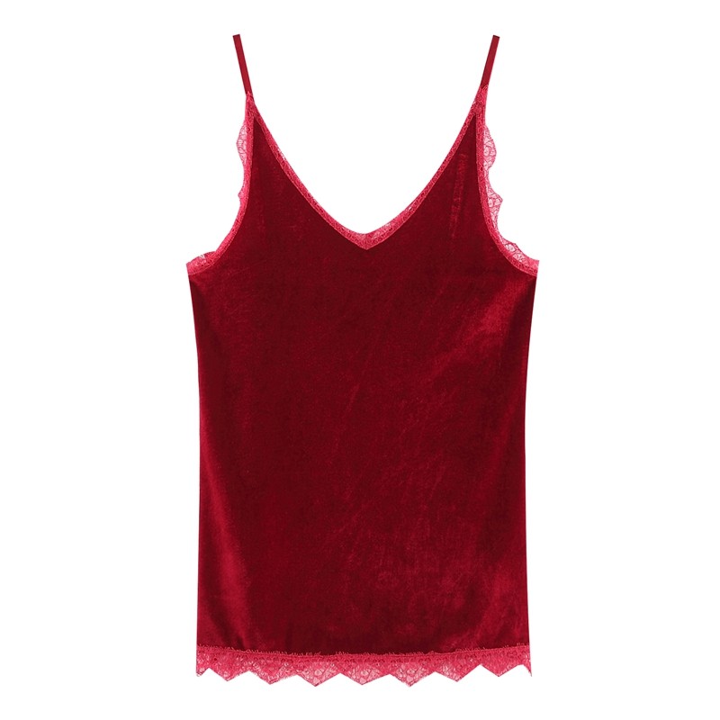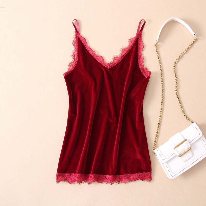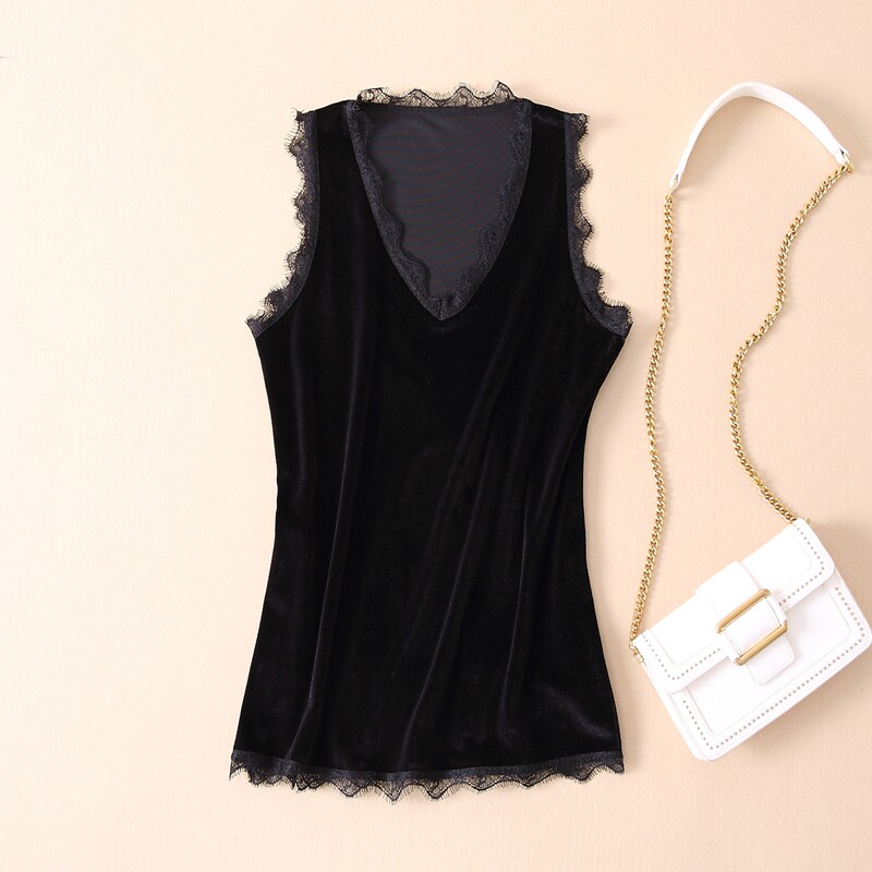 📚 弹力金丝绒蕾丝打底小吊带背心宽松短款丝绒内搭上衣黑色小衫加绒