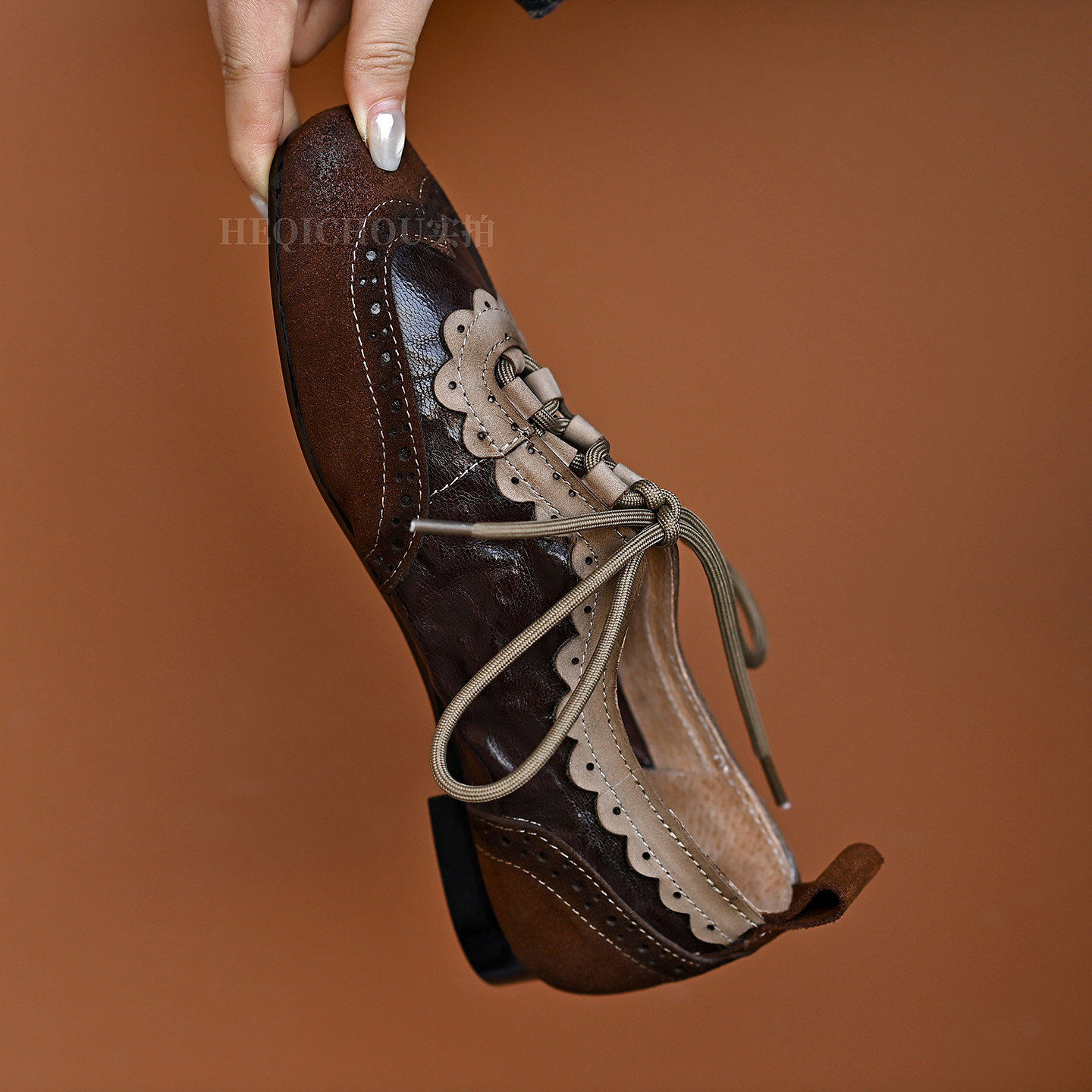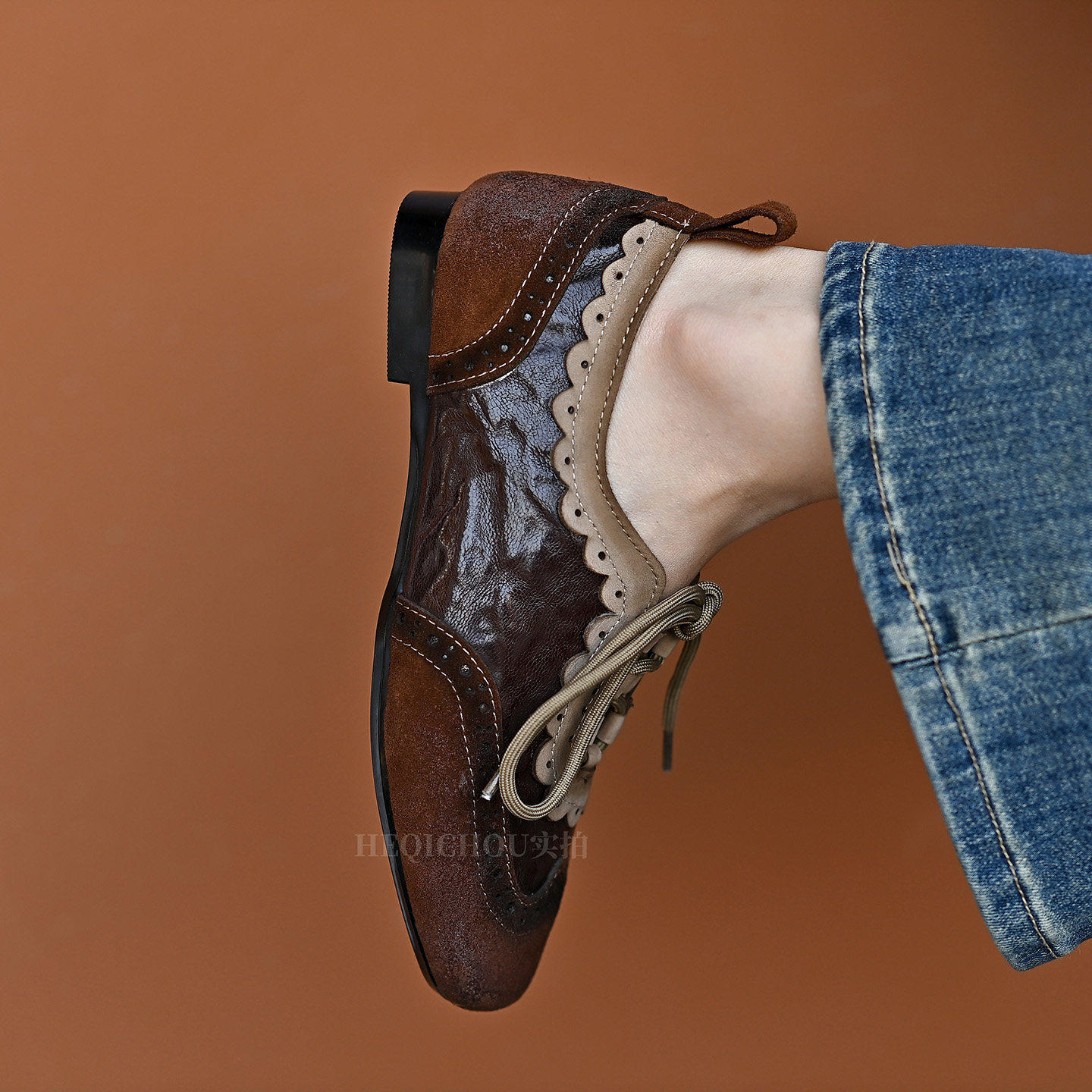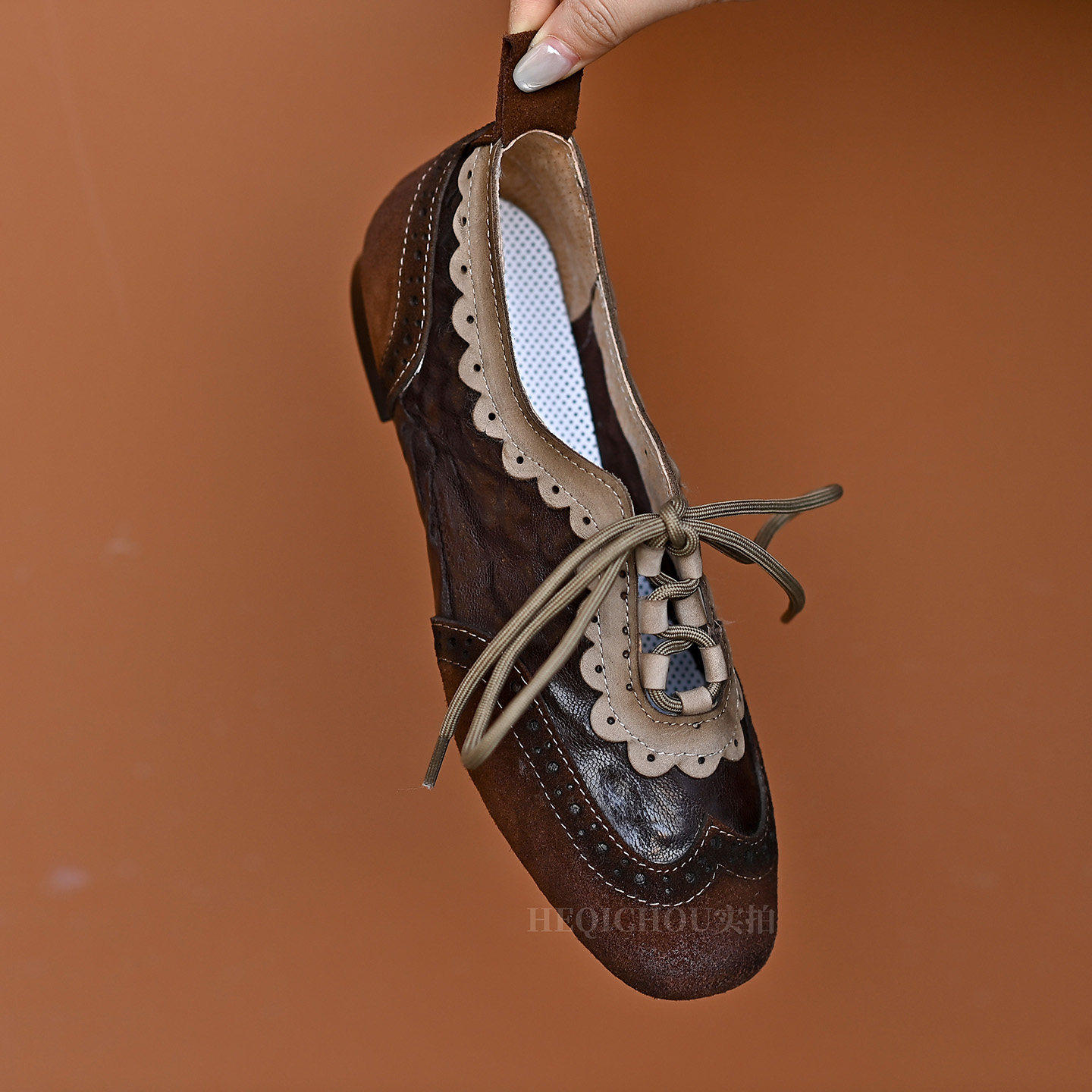 📚 何其丑软牛皮复古软底小皮鞋春秋新款真皮系带单鞋雕花平底乐福鞋