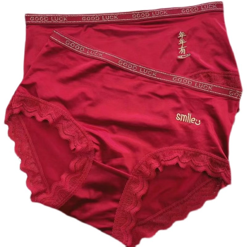 📚 女士内裤大红色新年本命年丝绸缎面丝滑刺绣中腰高弹包臀三角裤衩