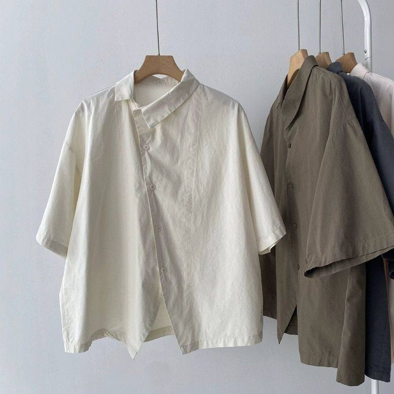 📚 夏季薄款百搭短袖女衬衣休闲日系简约气质衬衫设计感斜襟宽松上衣