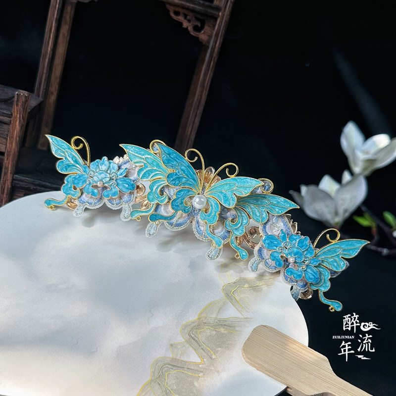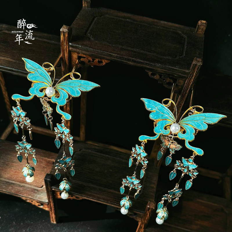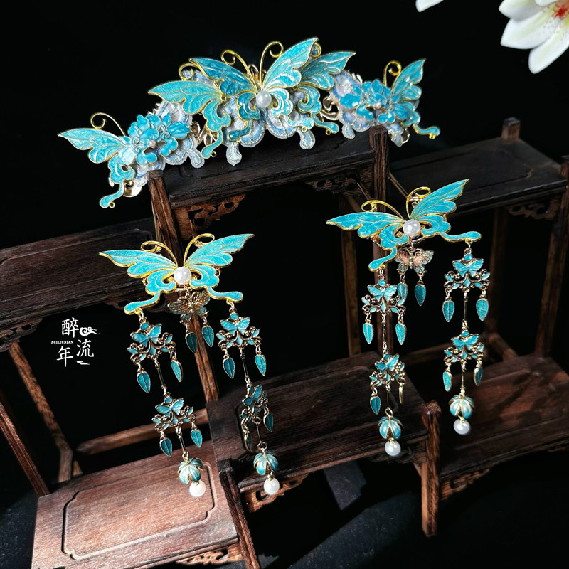 📚 【明清】蓝色清汉女头饰大发冠套装烧蓝蝴蝶流苏步摇明制国风发钗