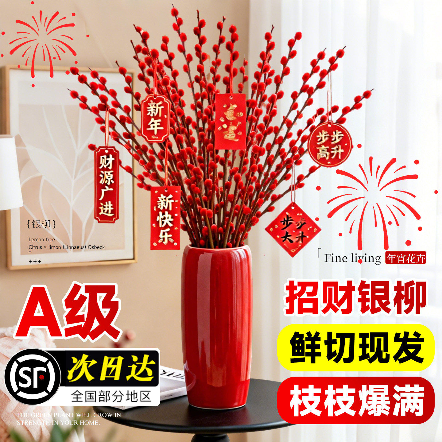 📚 招财银柳鲜枝特级红色真花鲜枝客厅摆件超大花苞银柳新年装饰红柳
