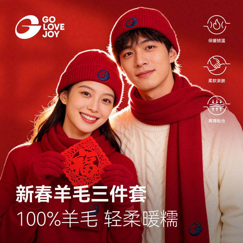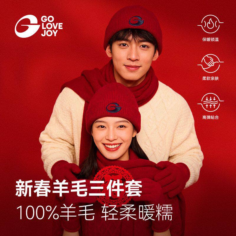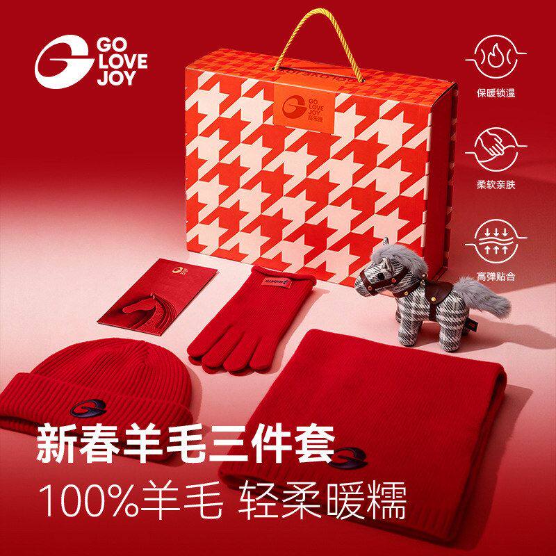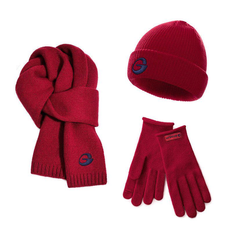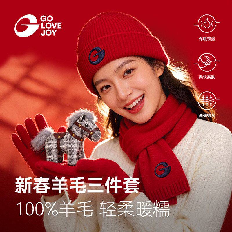 📚 高乐捷美丽诺羊毛红色围巾手套帽子三件套冬季保暖针织新年礼盒装