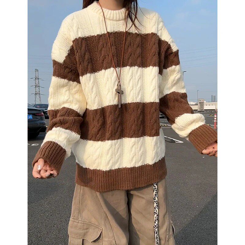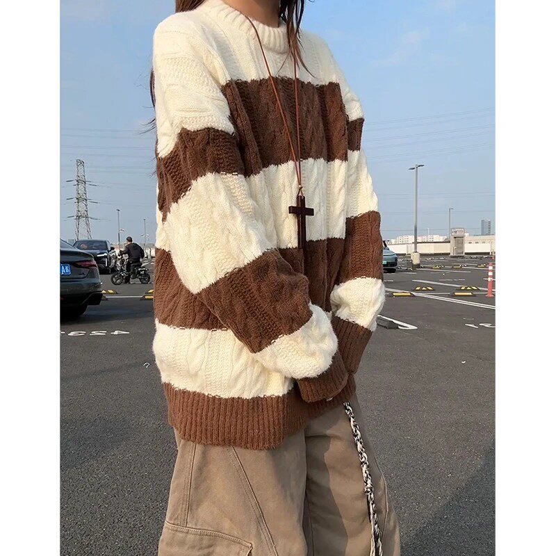 📚 咖色麻花圆领毛衣男款秋冬美式撞色条纹正肩卫衣高级感慵懒针织衫