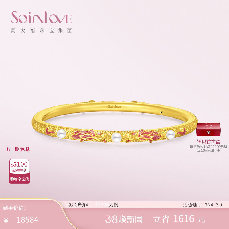 📚 周大福SOINLOVE蜜粉金十里红妆锦鲤珍珠黄金手镯女生日礼物