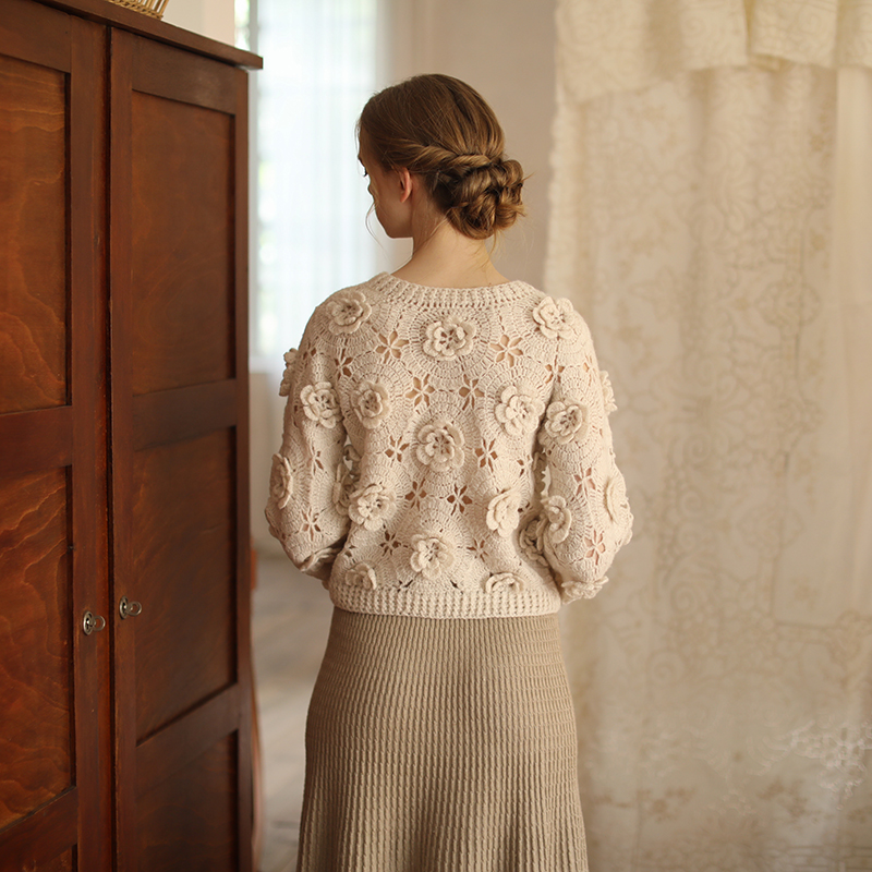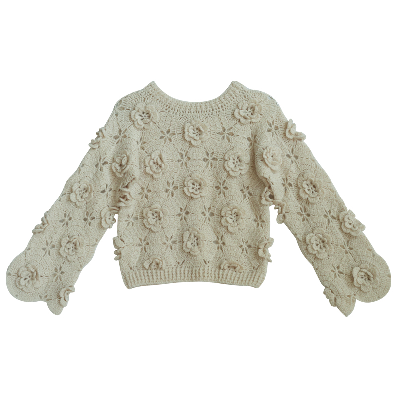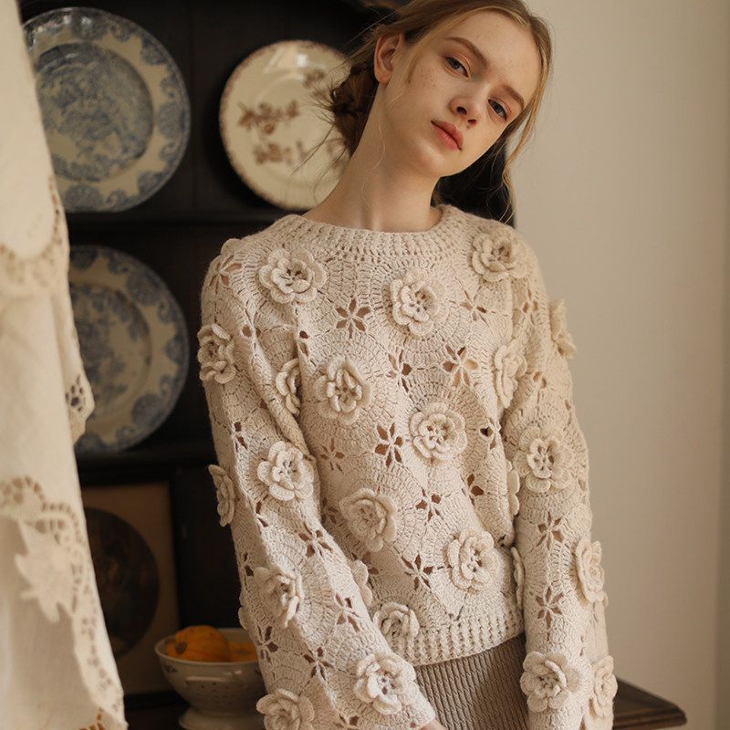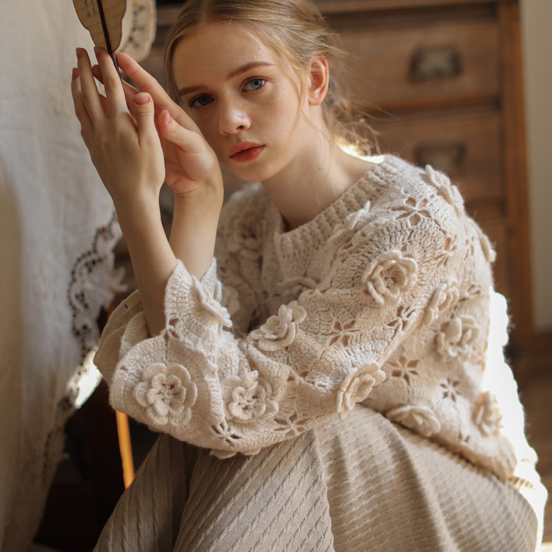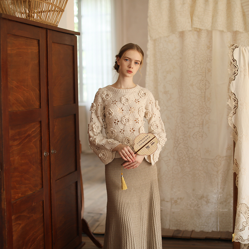 📚 脸儿艺 立体手工钩花 淡雅奶茶色新中式圆领 马海毛 森女套头毛衣