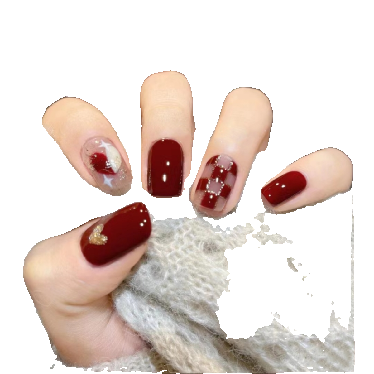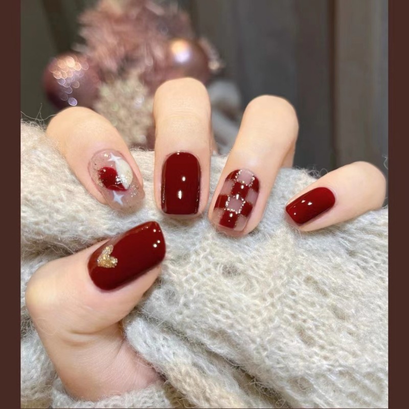 📚 手工穿戴甲 枣红甜心 敲显白棋盘格爱心秋冬气质美甲