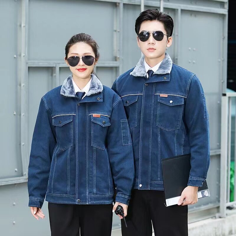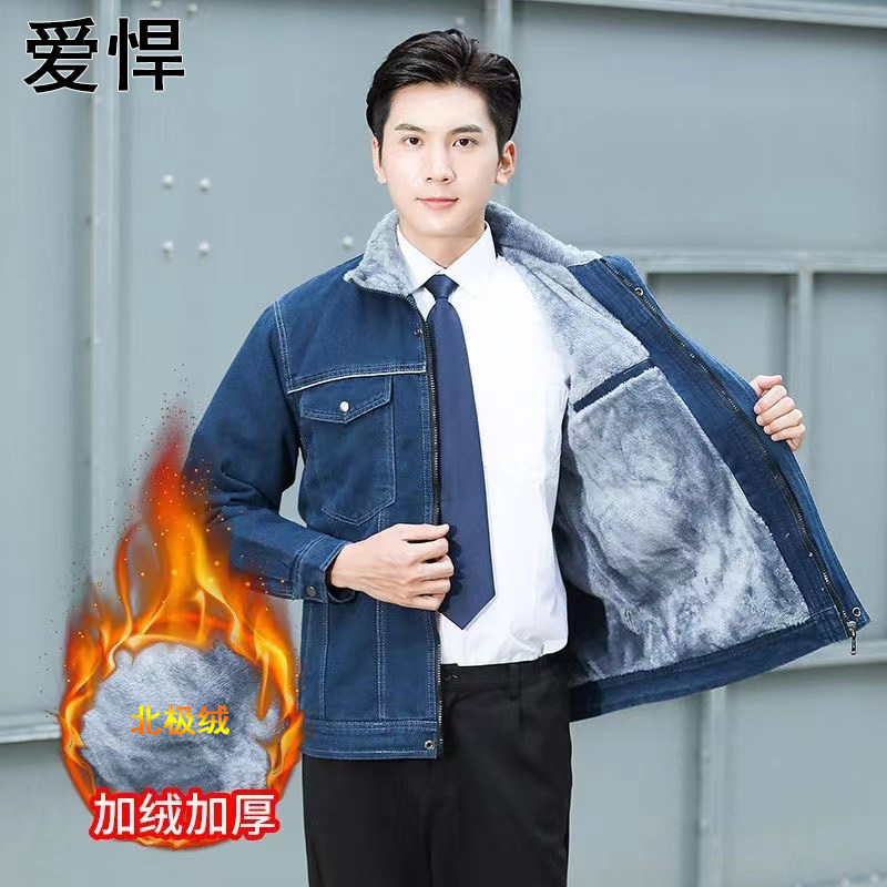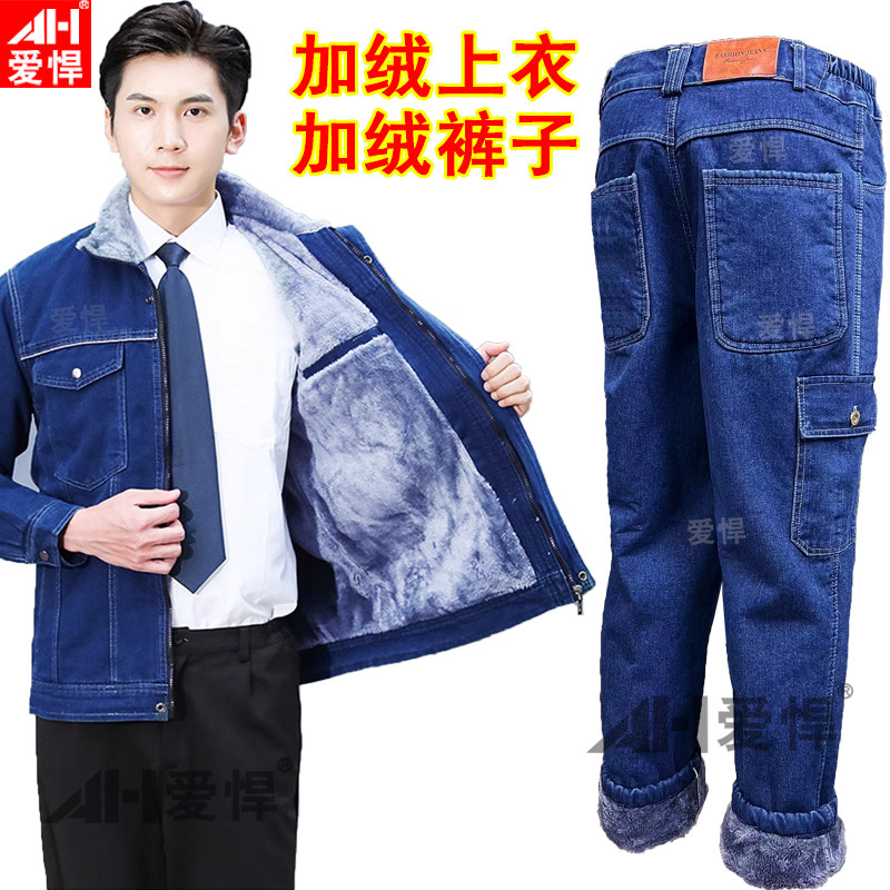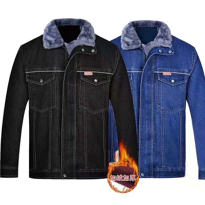 📚 冬季加绒加厚牛仔工作服套装男棉服焊工服上衣裤子电焊劳保服防烫