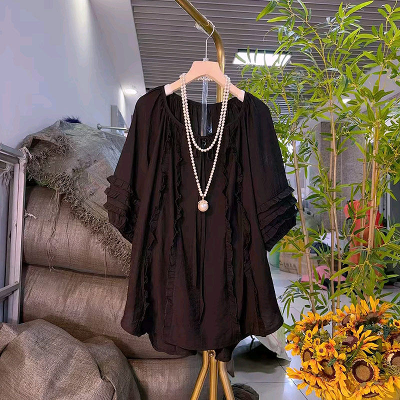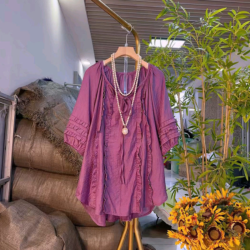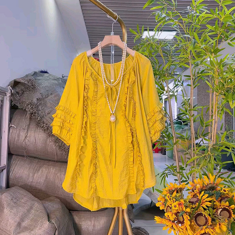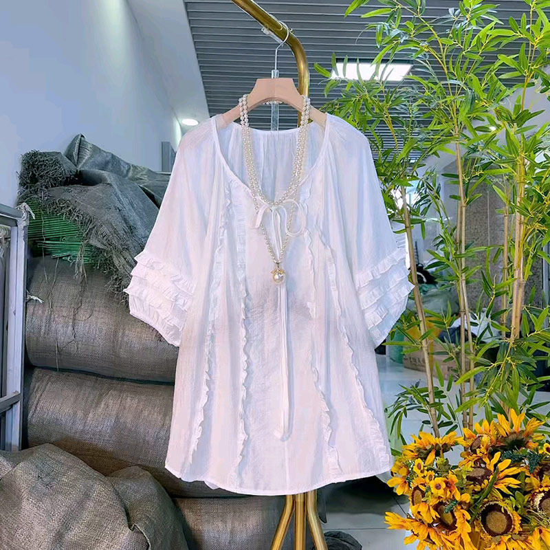 📚 胖MM加肥系带领荷叶边短袖上衣大码女装宽松遮肚子夏季款百搭小衫
