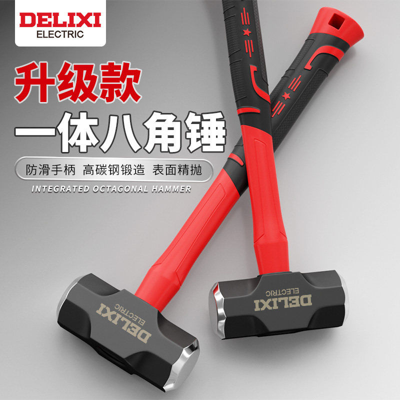 📚 德力西锤子八角锤工具橡胶柄榔头软把高碳钢实心一体大号砸墙铁锤