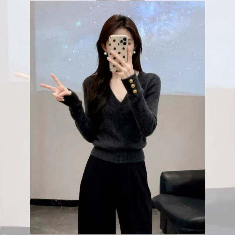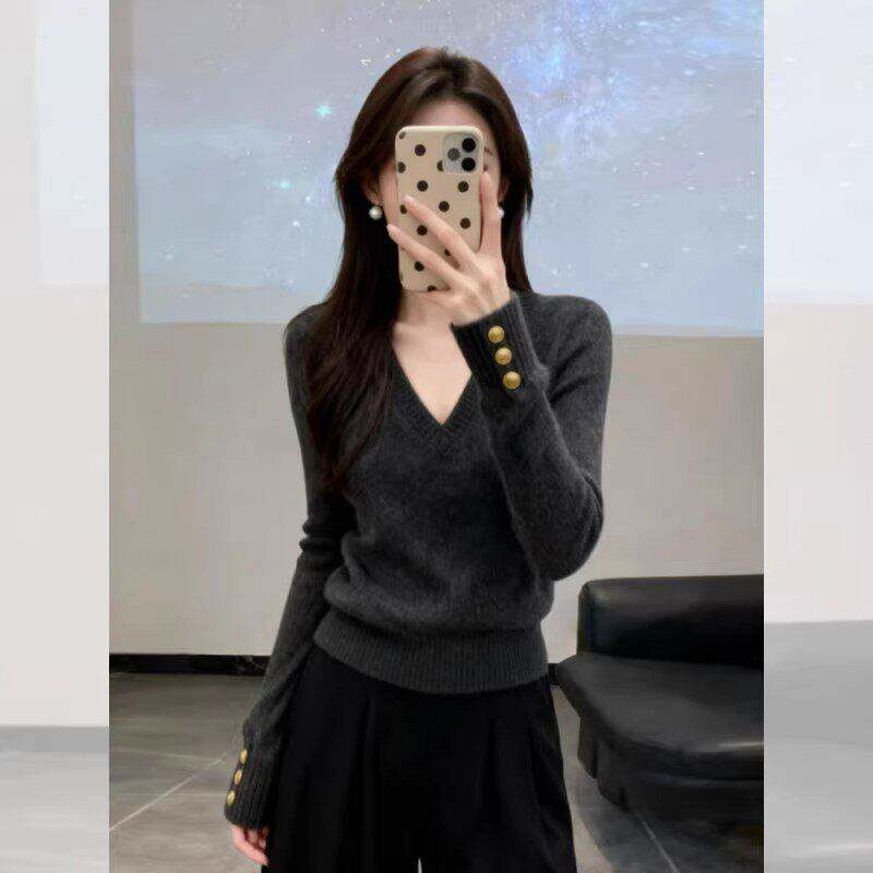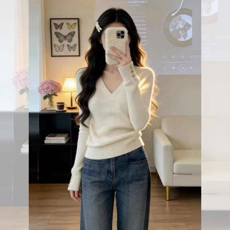 📚 法式白领白色V领针织打底衫女秋冬高级感毛衣内搭独特超好看上衣