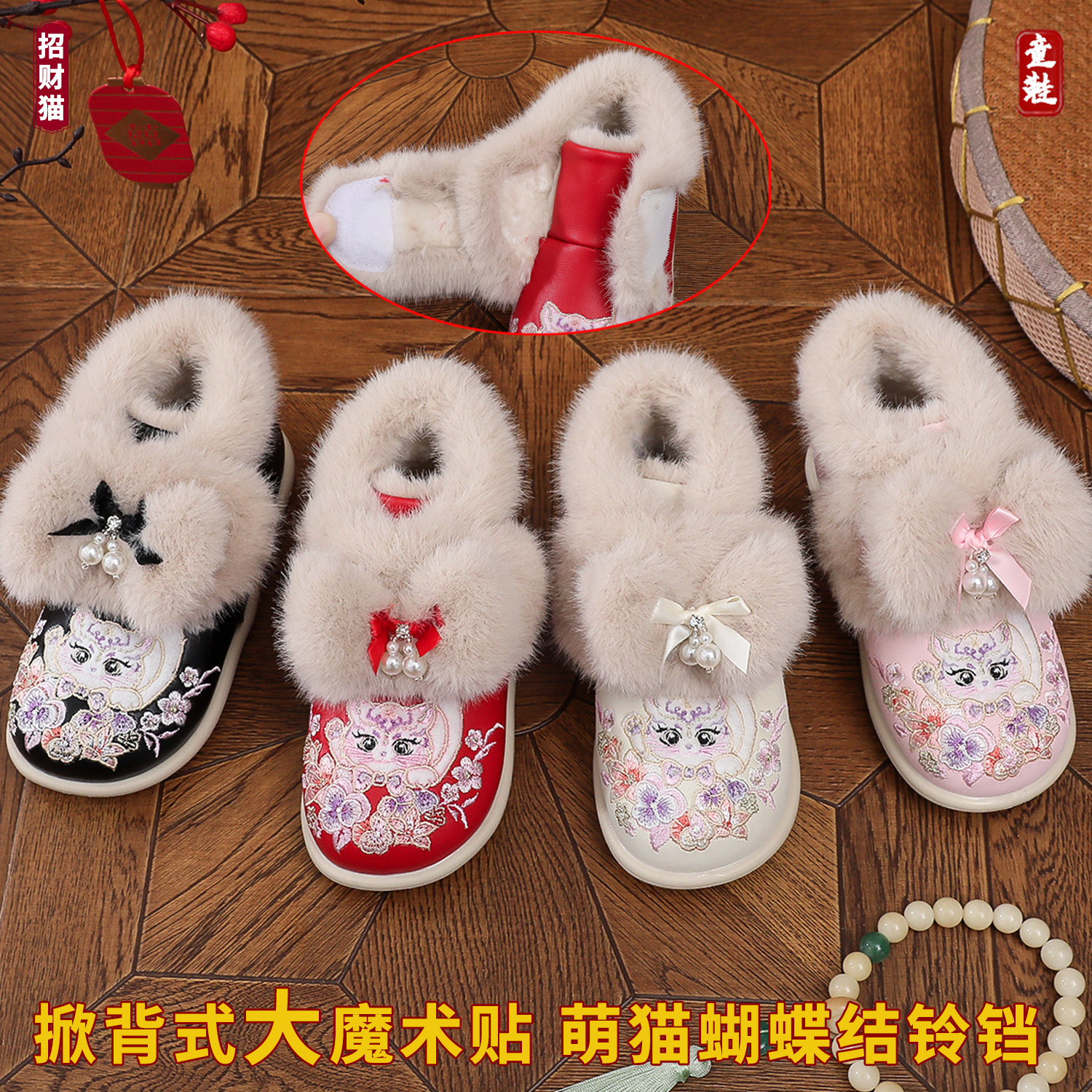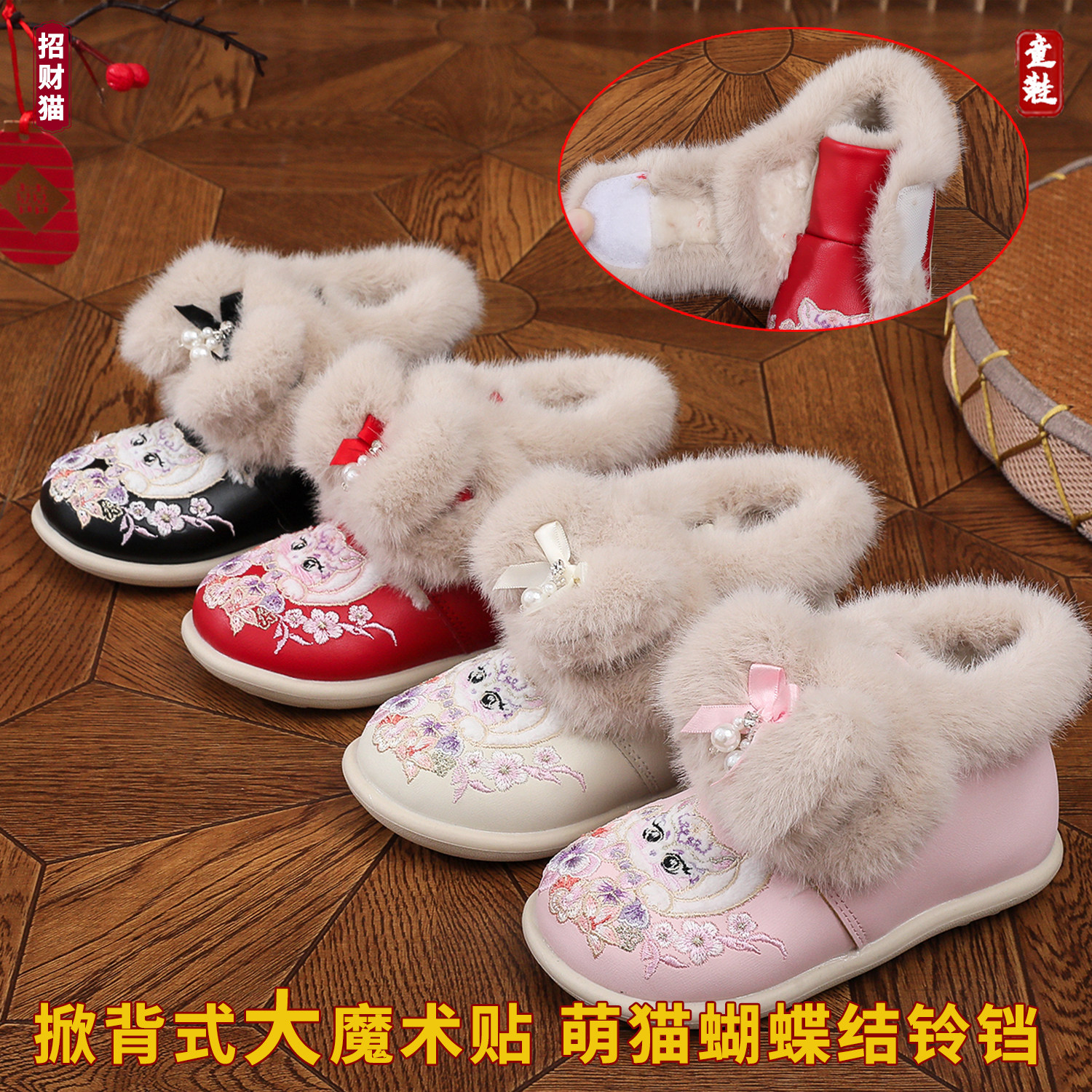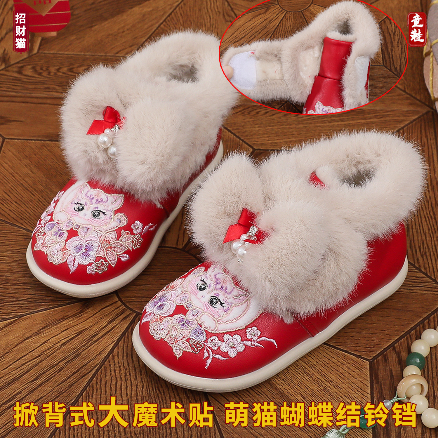 📚 汉服鞋女童冬季皮面防水2025新款中式国风雪地靴拜年儿童绣花棉鞋