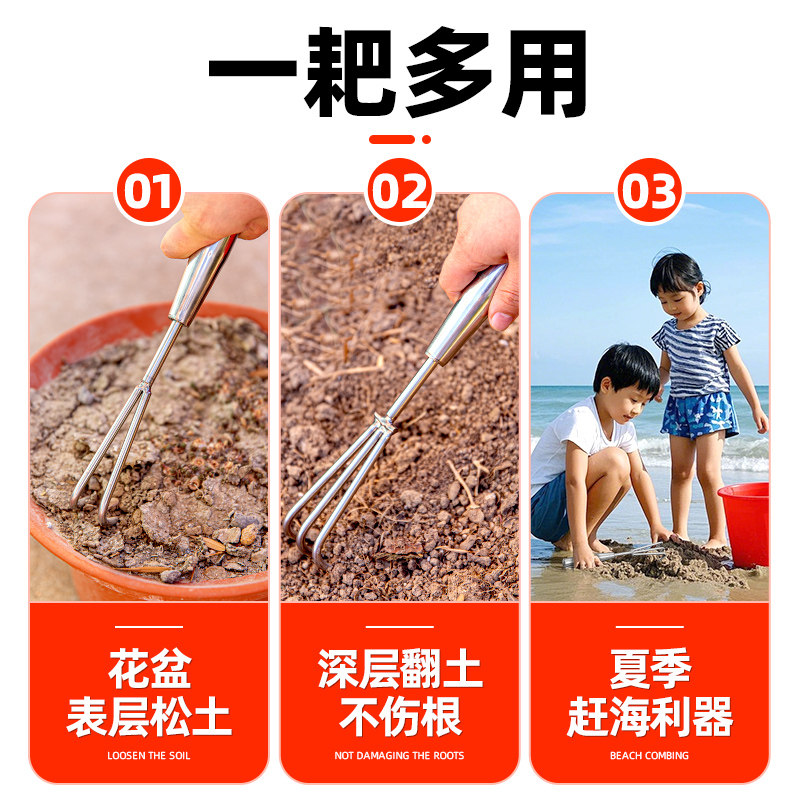 📚 花盆松土神器小耙子园艺工具盆景翻土家用不锈钢除草多齿多爪赶海