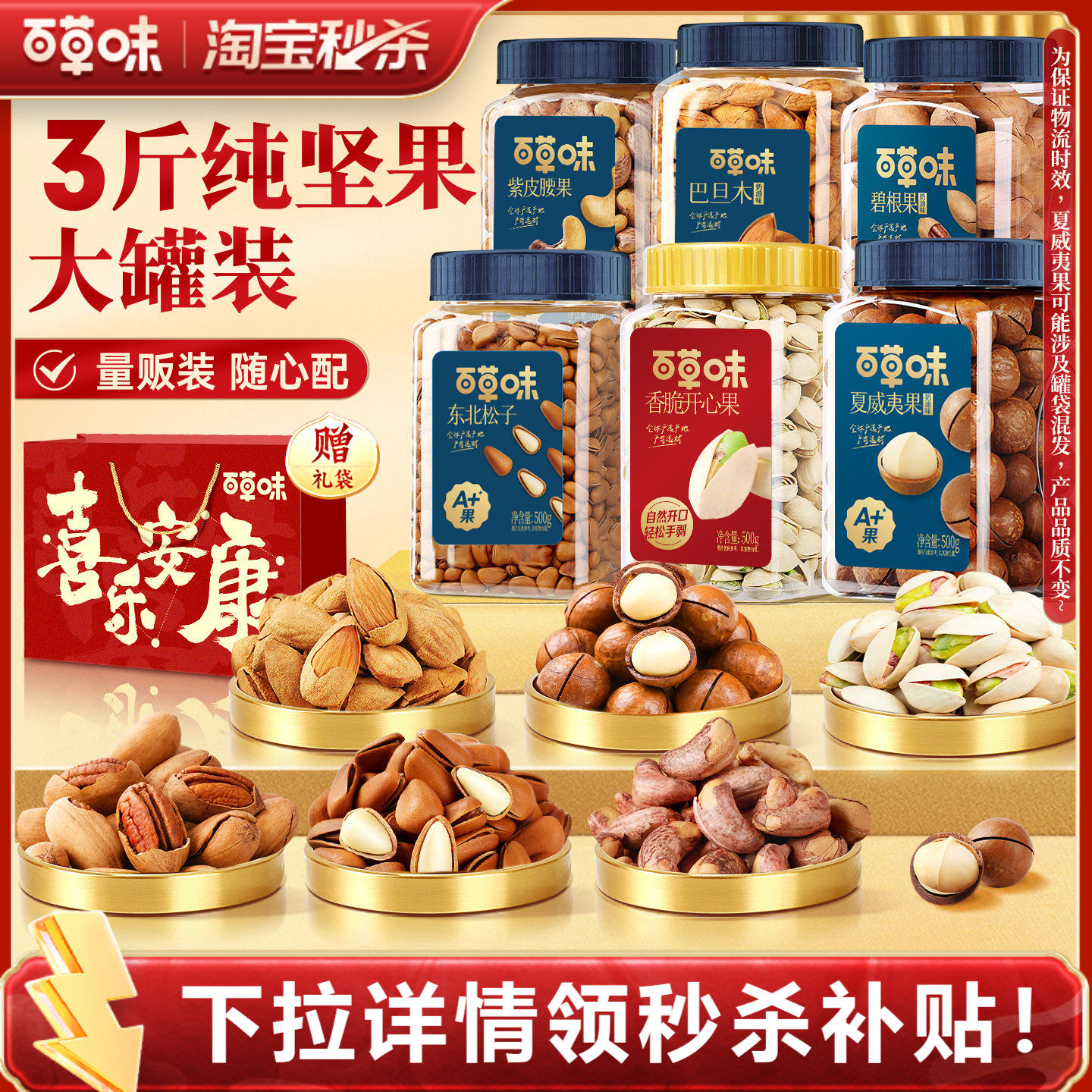 📚 百草味3罐装3斤坚果礼盒组合干果腰果开心果松子礼包新年送礼年货