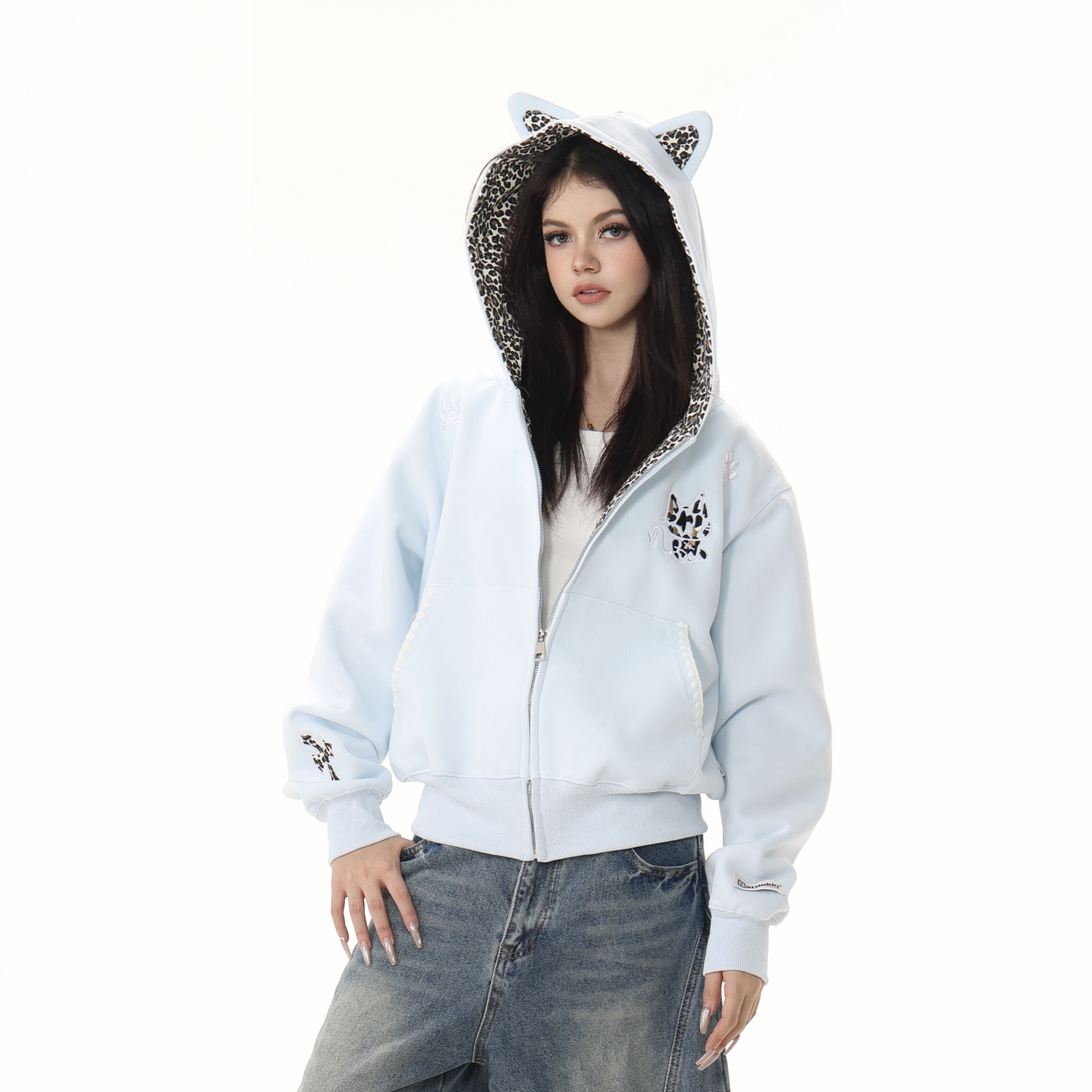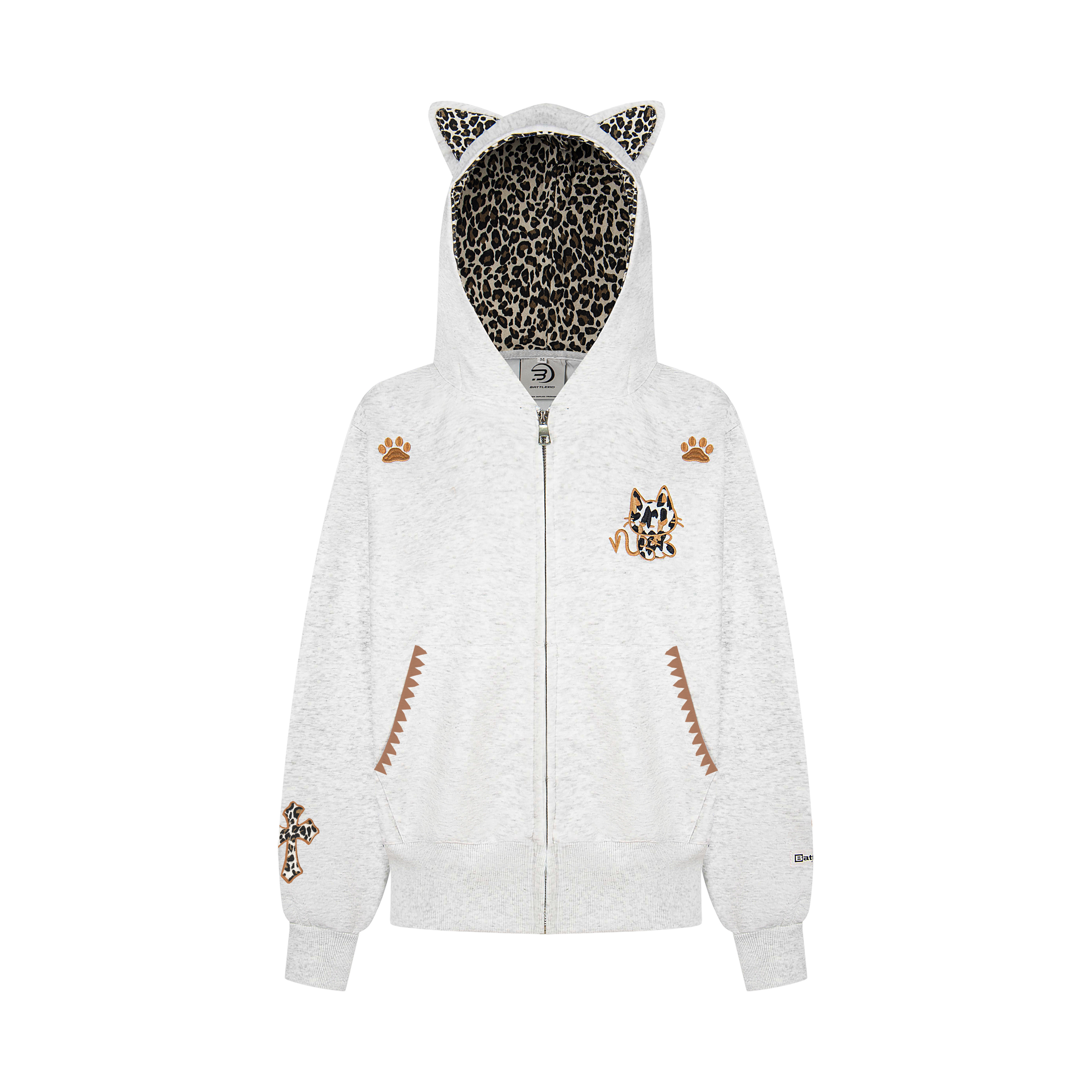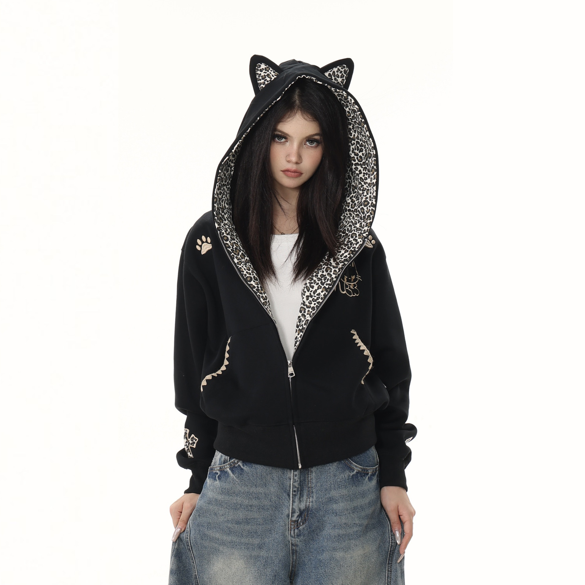 📚 【零碎岛屿】美式小恶魔贴布豹纹连帽拉链外套秋冬男女情侣卫衣潮