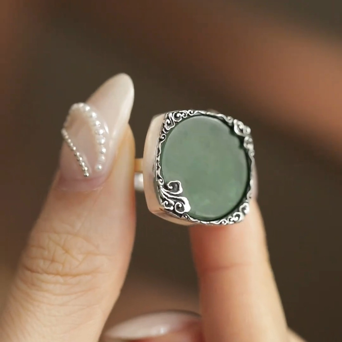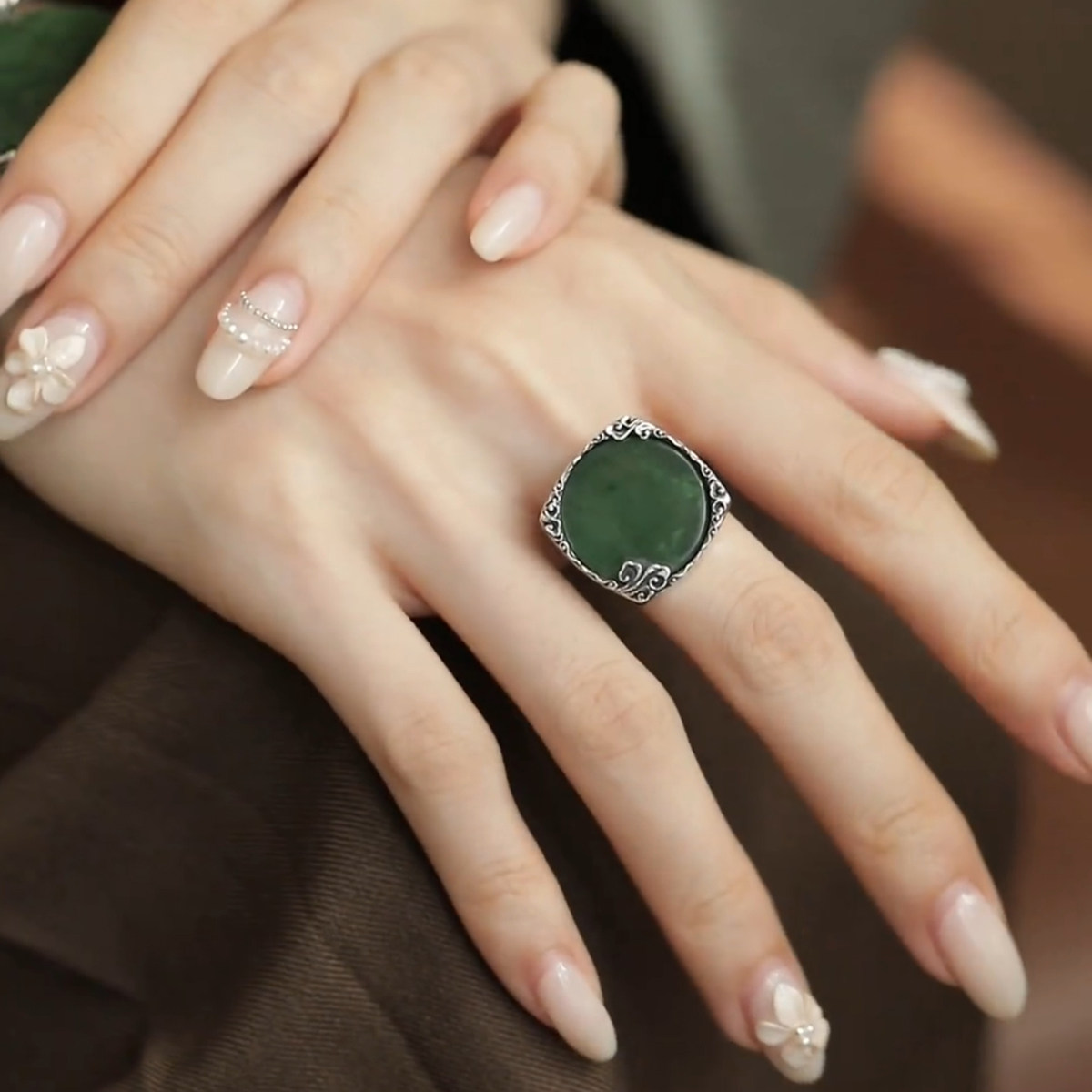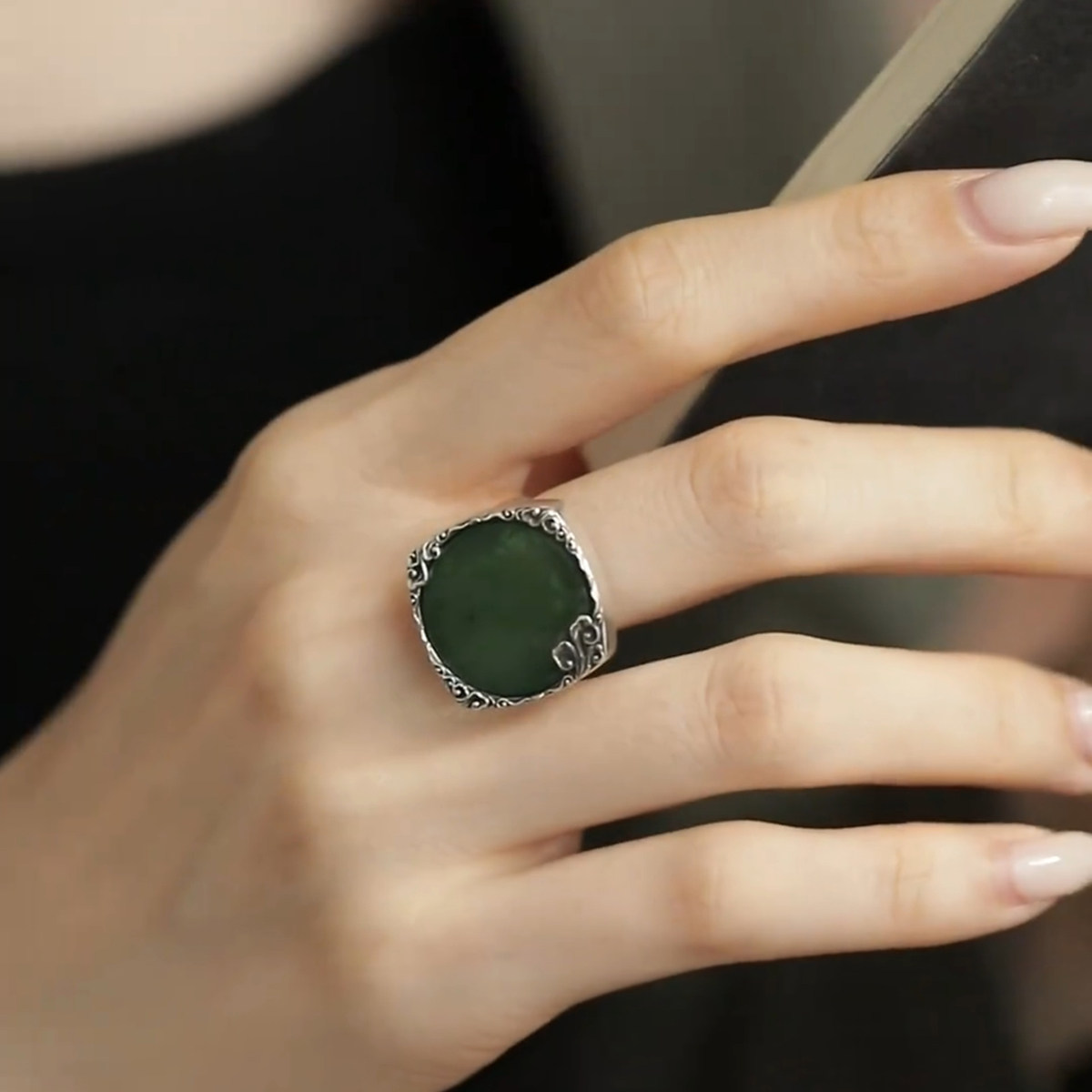 📚 925银圆牌祥云戒指女新中式小众镶和田碧玉开口可调节高级感指环