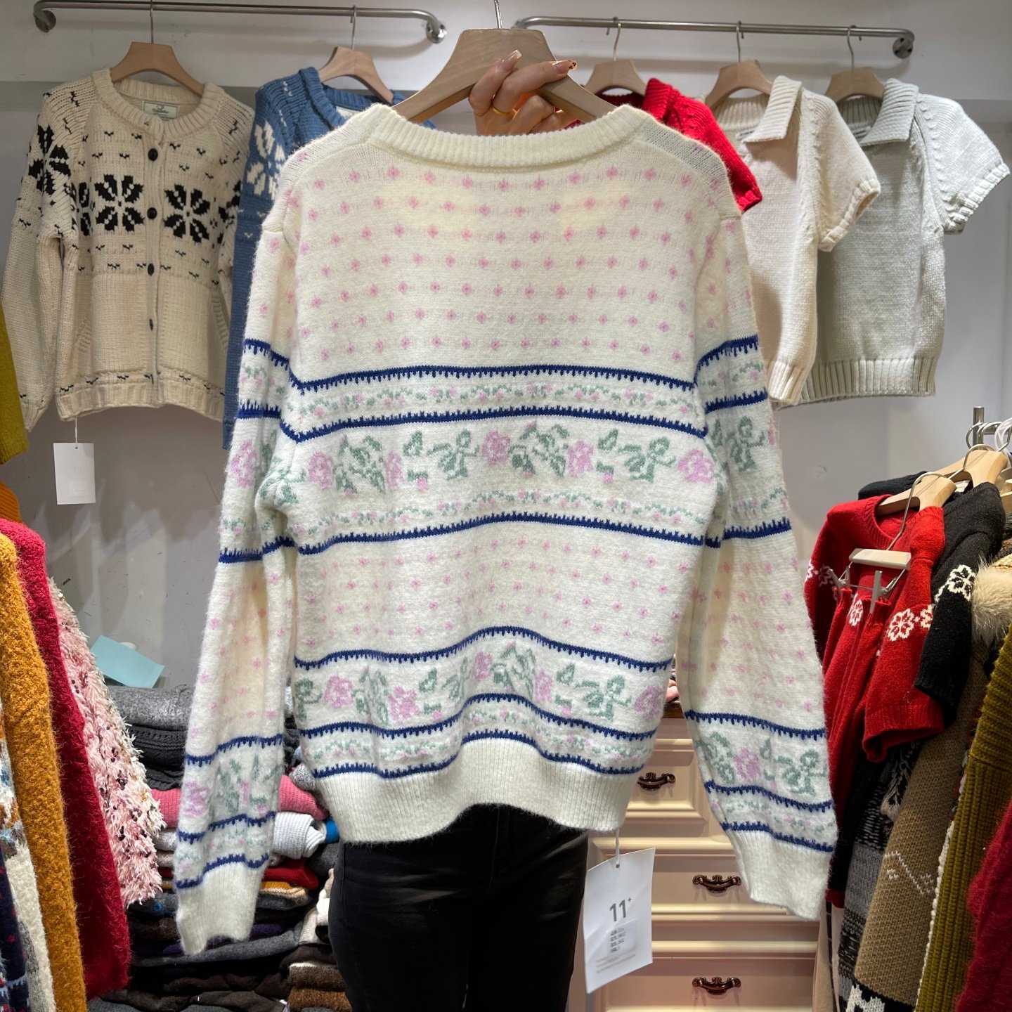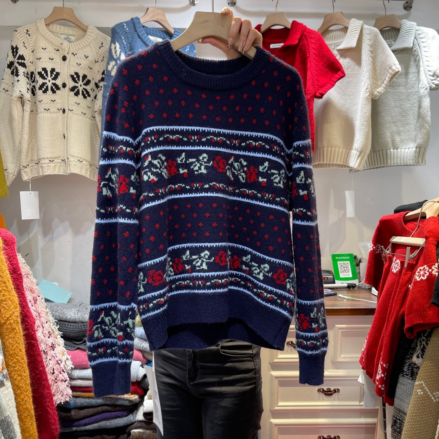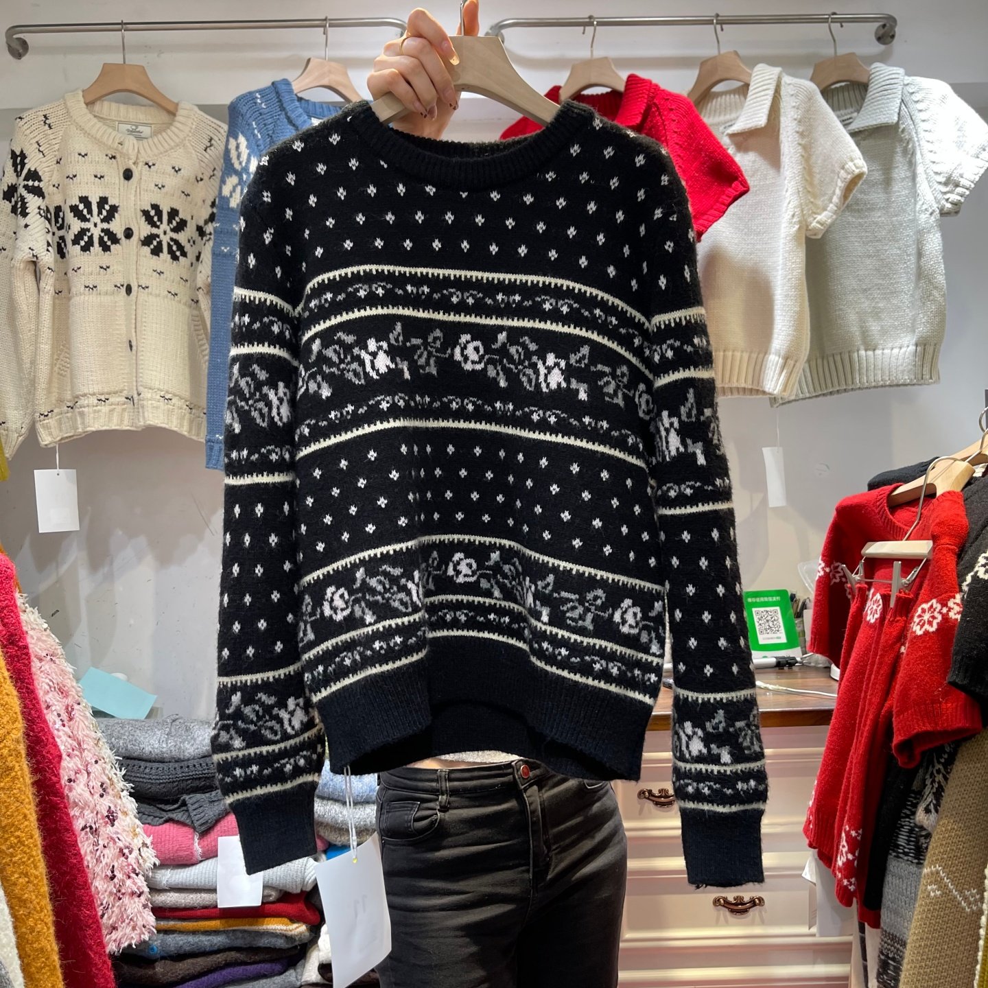 📚 韩系复古费尔岛毛衣女圆领玫瑰提花懒惰风针织衫套头2025冬季穿搭