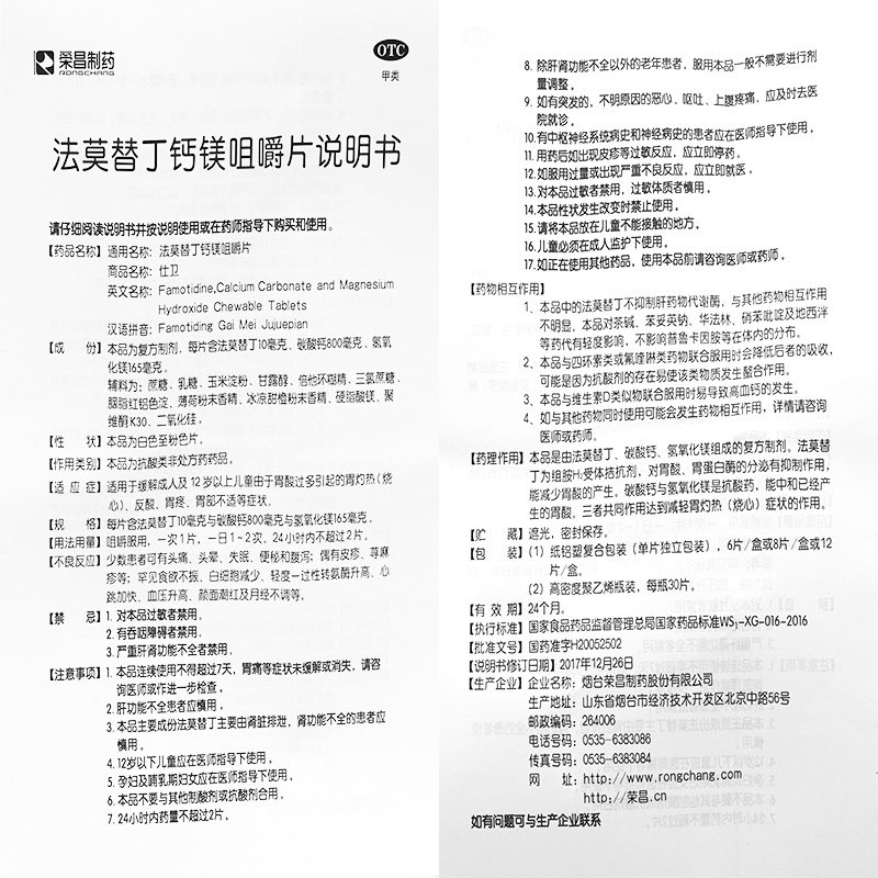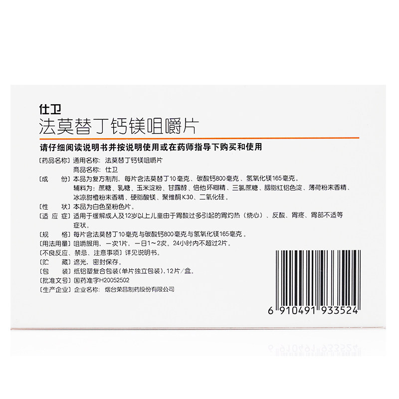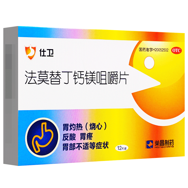 📚 荣昌 仕卫法莫替丁钙镁咀嚼片12粒胃酸过多烧心胃疼正品胃药成人
