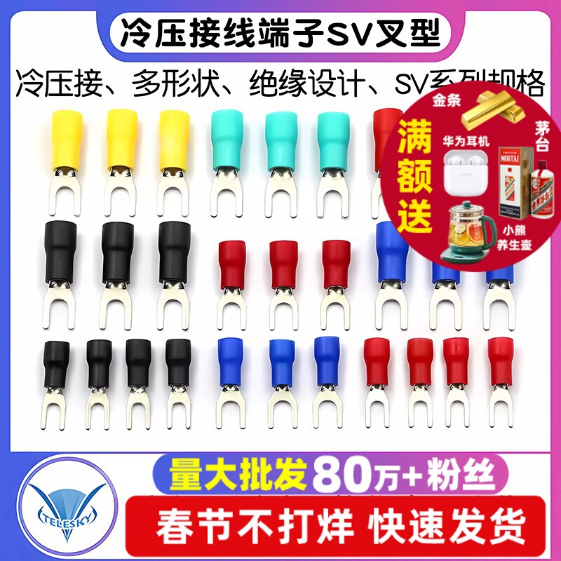 📚 冷压接线端子SV3.5叉形U型Y型绝缘插片插簧连接器接头铜头SV1.25