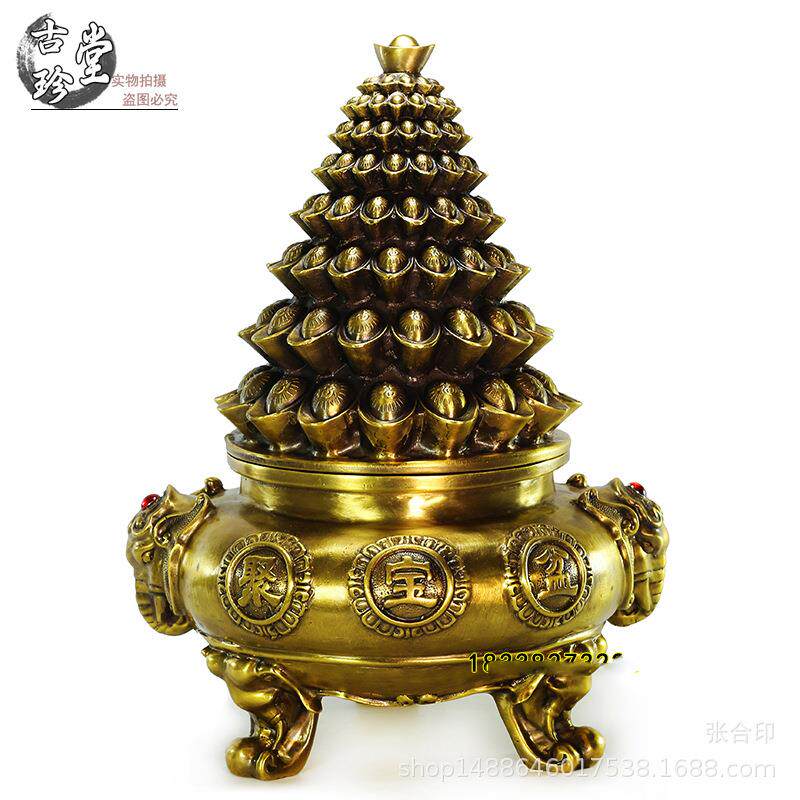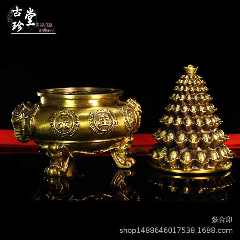 📚 纯铜元宝聚宝盆摆件带盖福字元宝三足财盆居家玄关金属工艺品摆饰