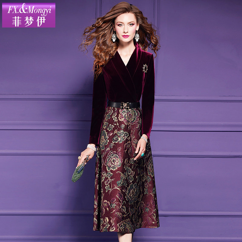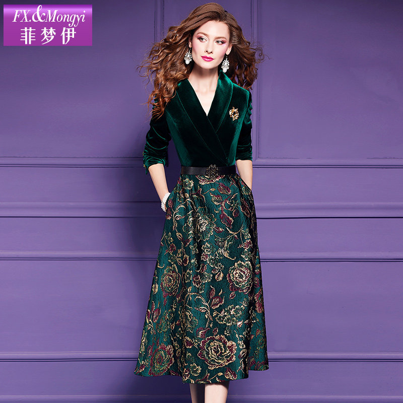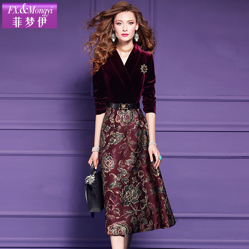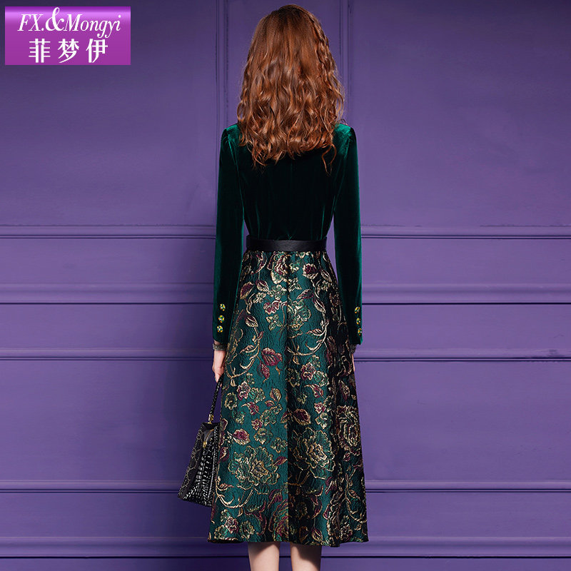 📚 菲梦伊提花金丝绒连衣裙女秋季阔太太高贵优雅收腰气质假两件裙子
