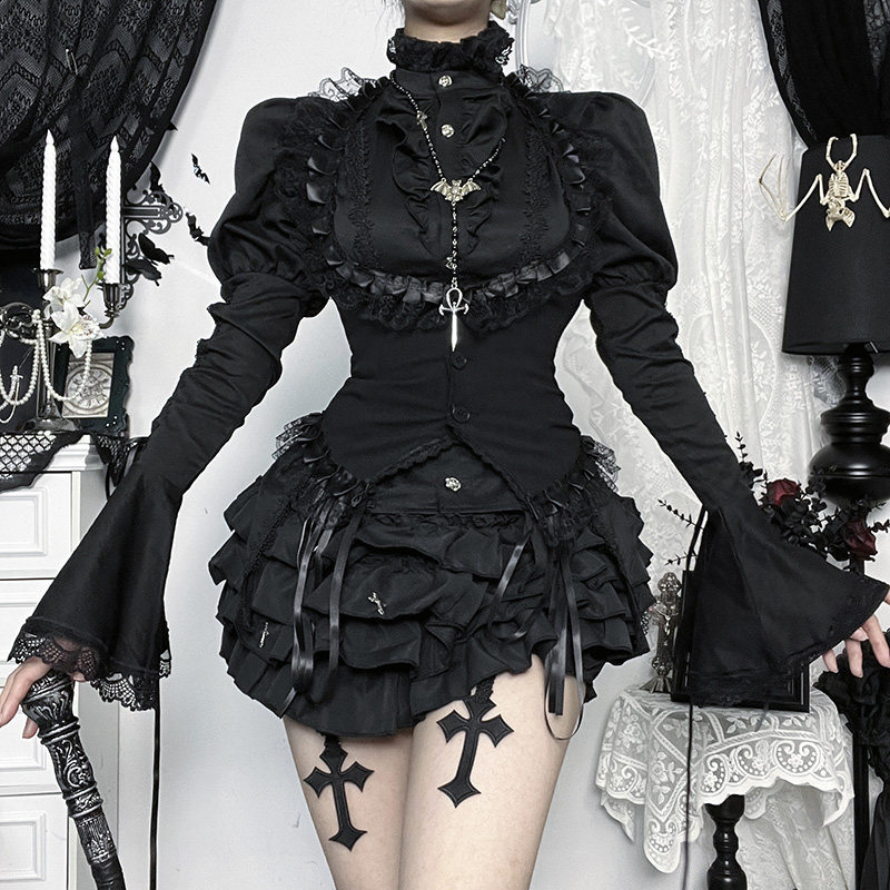 📚 Wannathis哥特风黑色长袖衬衫亚文化上衣亚比半身裙套装辣妹穿搭