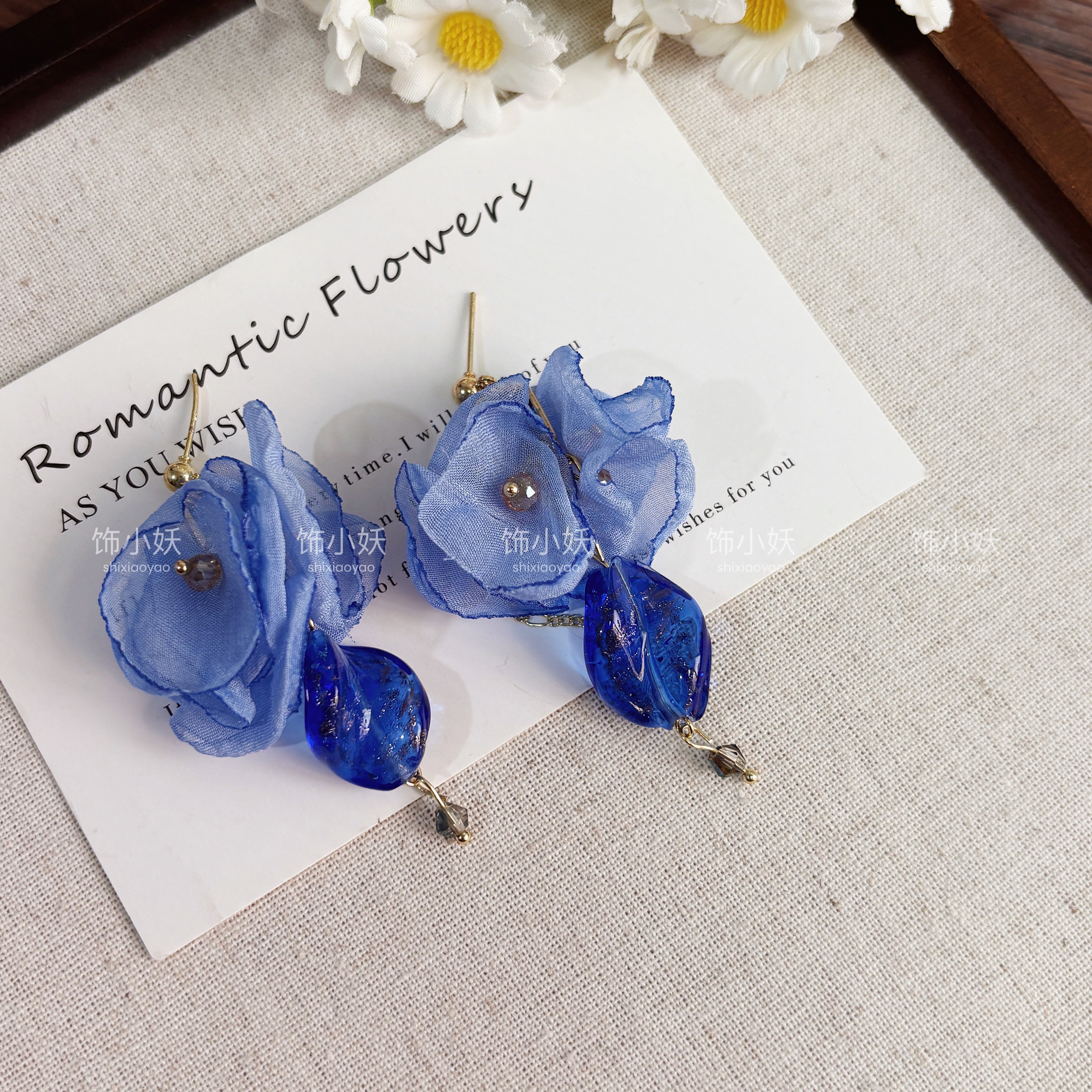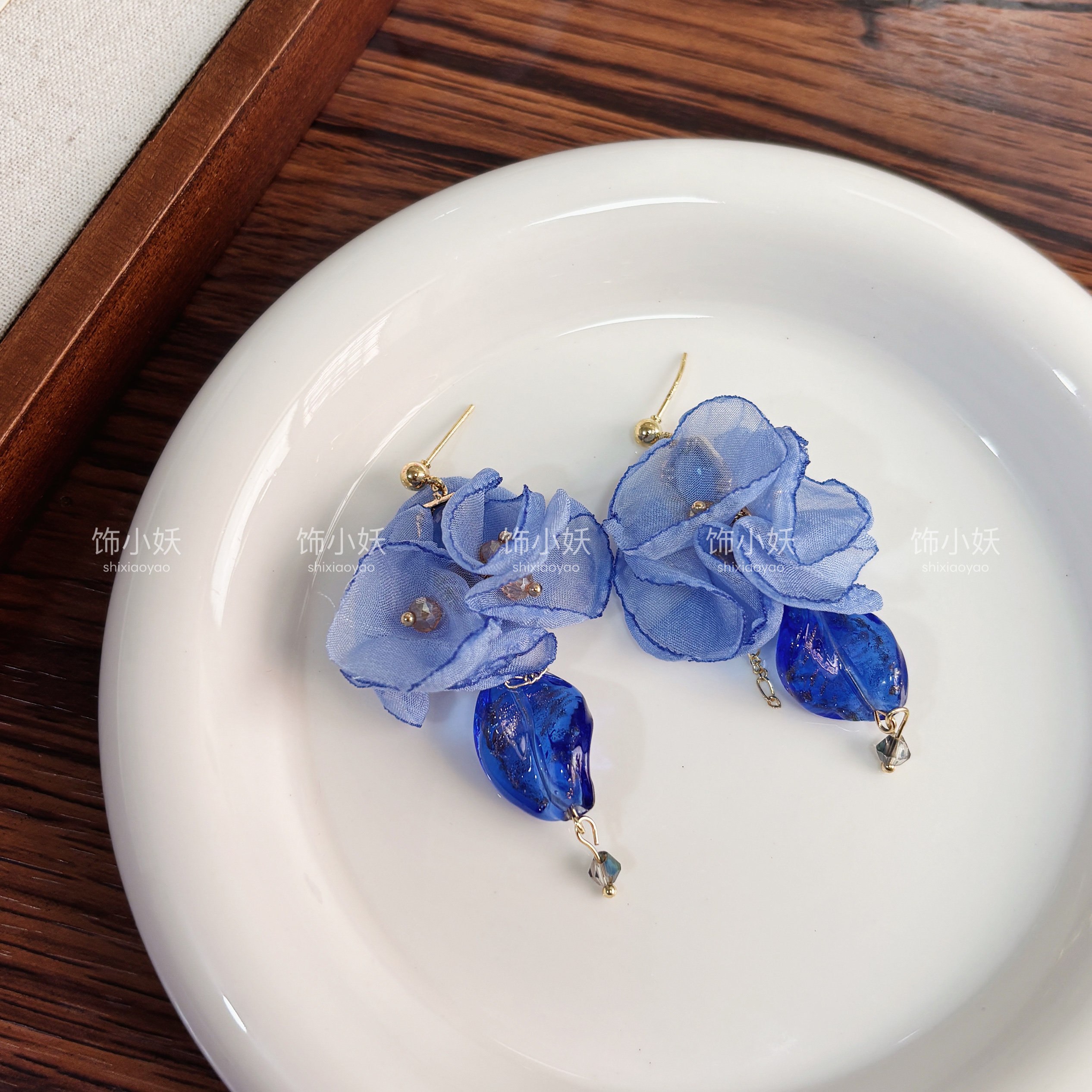 📚 钟楚曦同款蓝色雪纺花朵流苏耳环高级感渐变花瓣耳钉耳饰2025新款