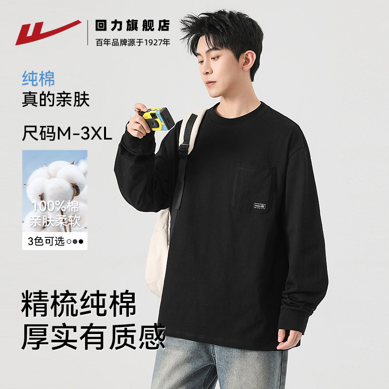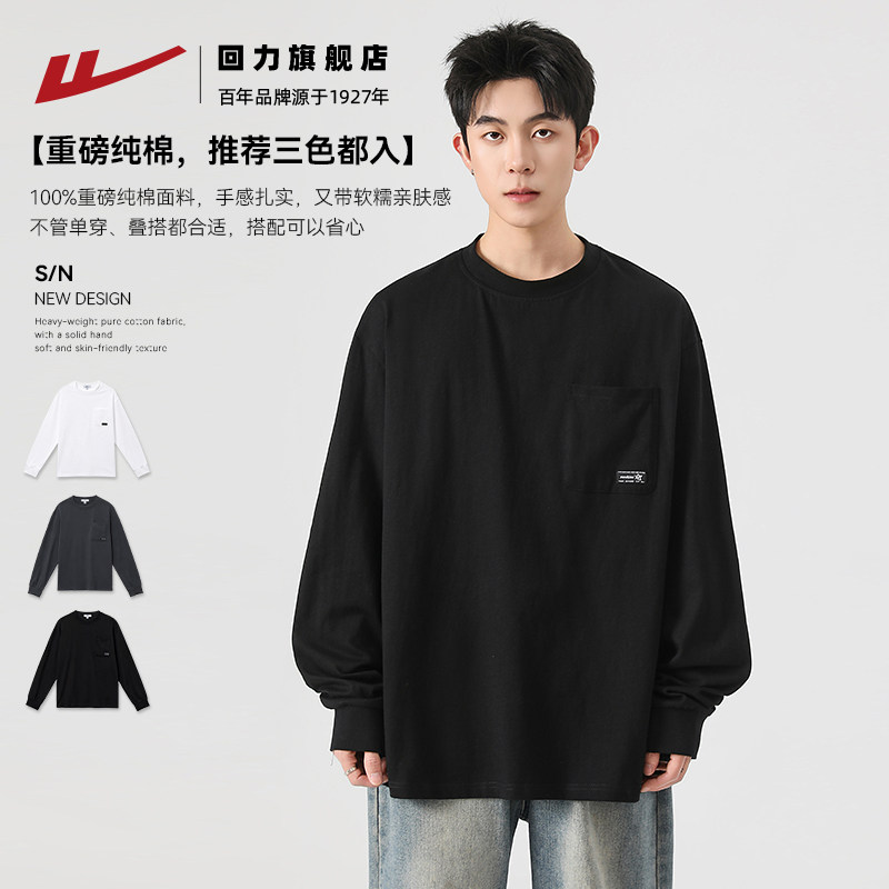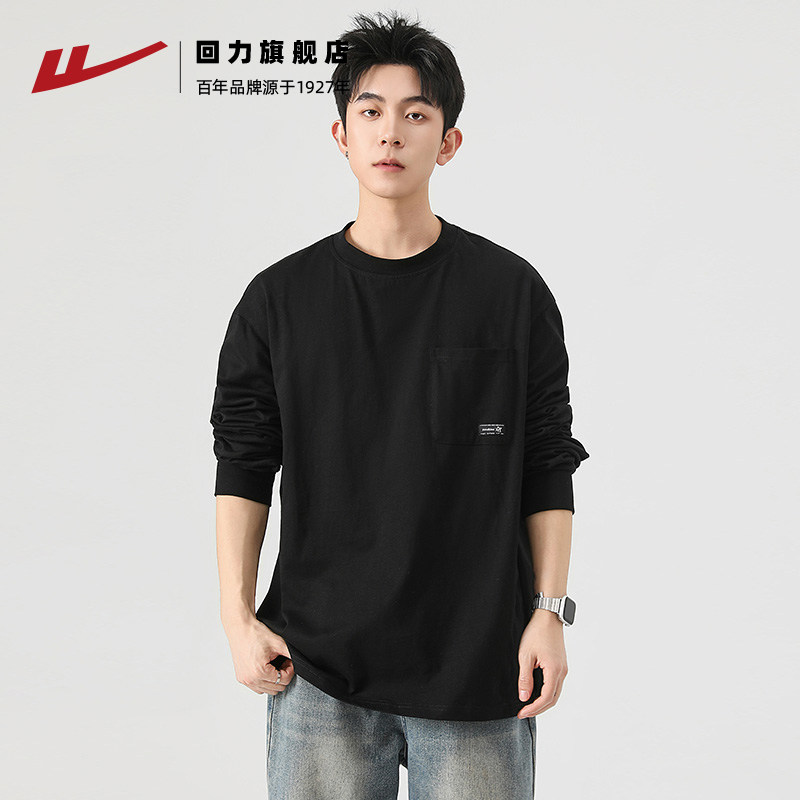 📚 回力重磅纯棉长袖T恤男款春秋季新款圆领黑色卫衣男士内搭打底衫
