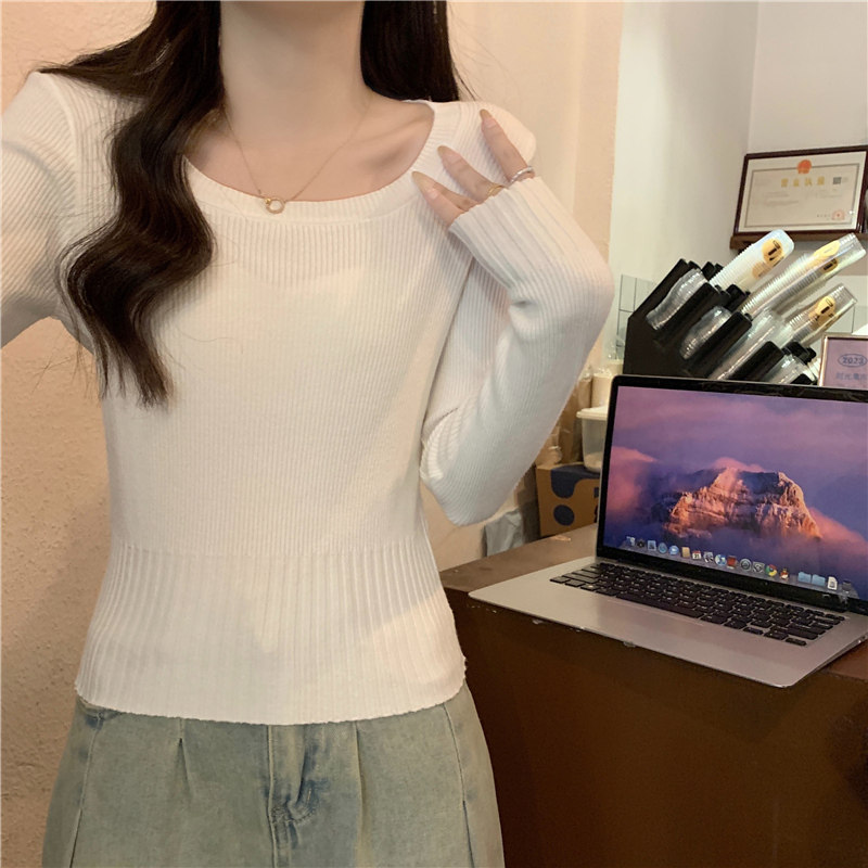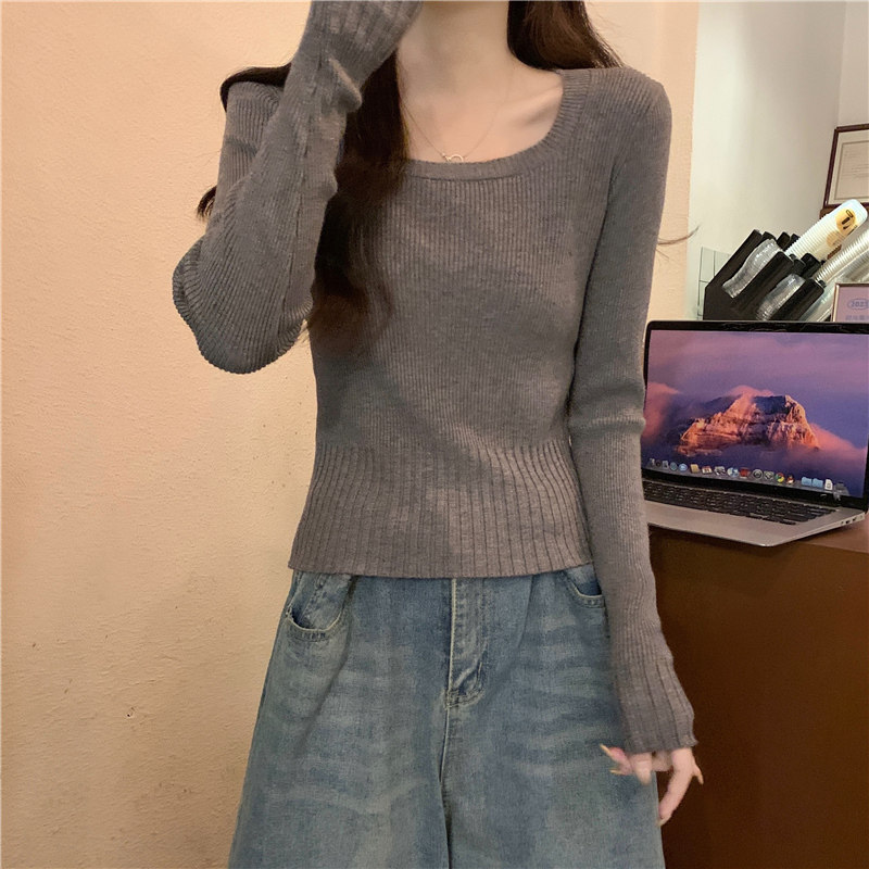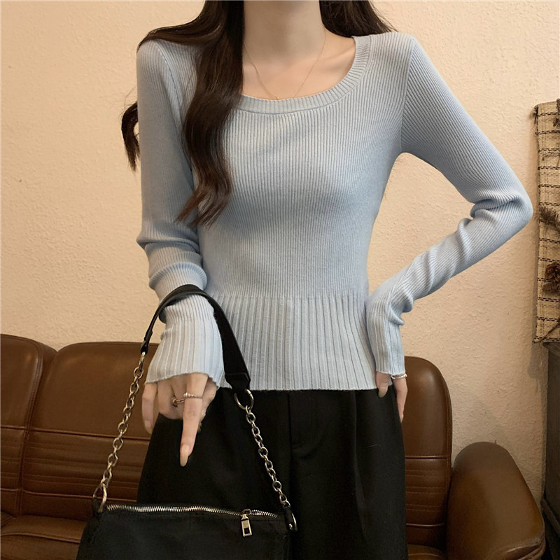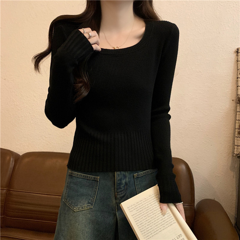 📚 法式方领毛衣女内搭打底衫秋冬修身显瘦小个子短款长袖针织衫上衣