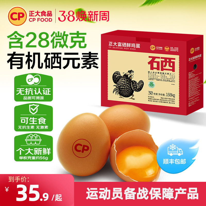 📚 正大富硒新鲜鸡蛋30枚无沙门氏菌无抗认证生鲜鸡蛋礼盒1.68kg整箱