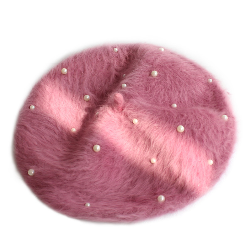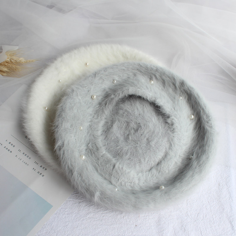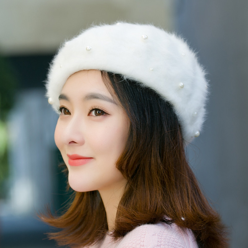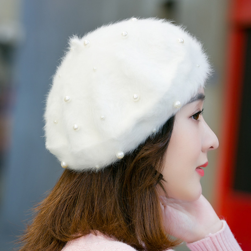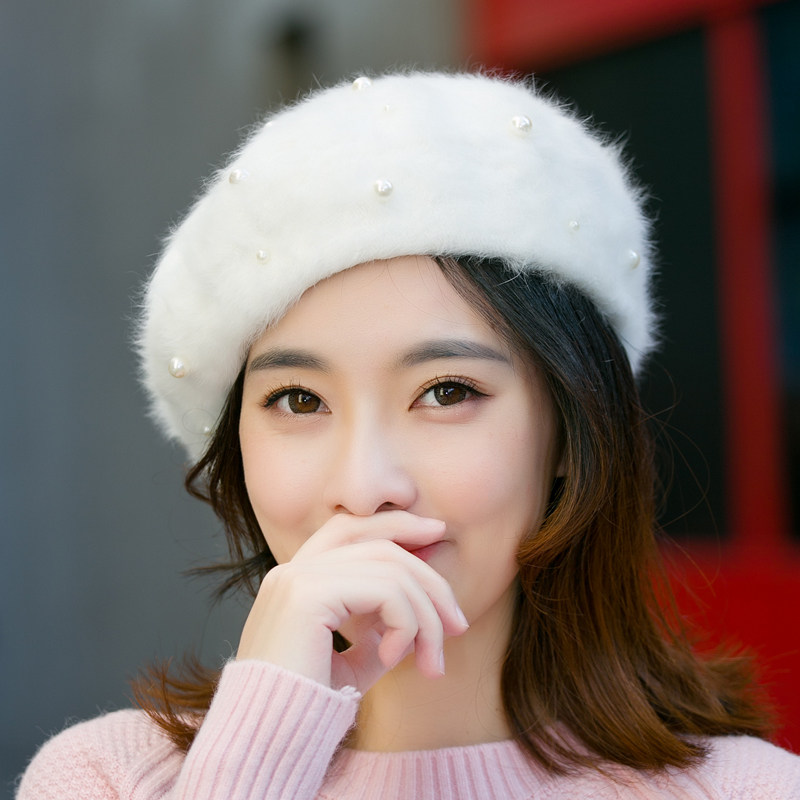 📚 秋冬韩版复古手工钉珠子蓓蕾帽日系真兔毛绒白色贝雷帽女画家帽潮
