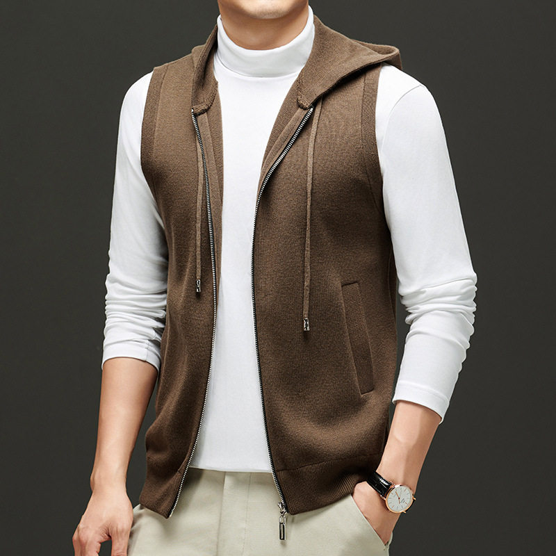 📚 2024秋冬男士马甲桑蚕丝羊毛针织拉链坎肩外套口袋带帽背心针织衫