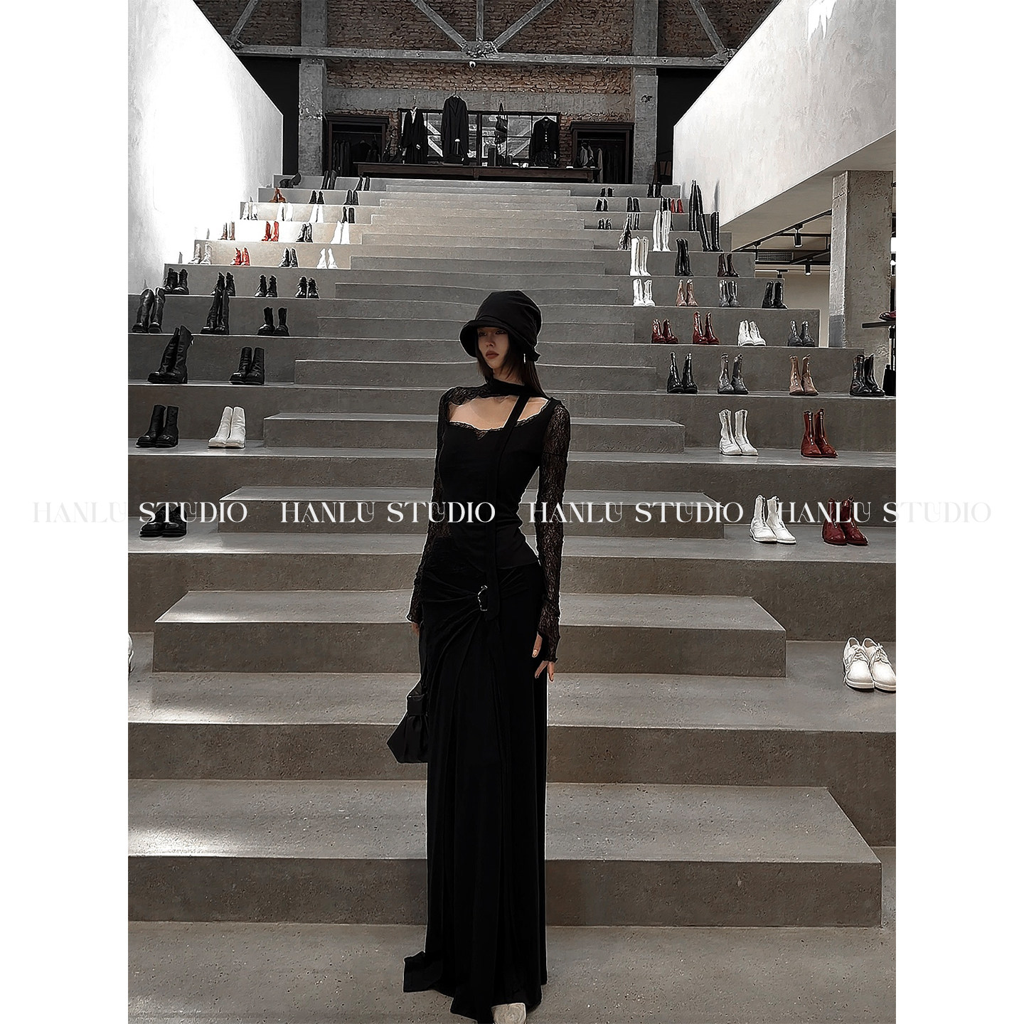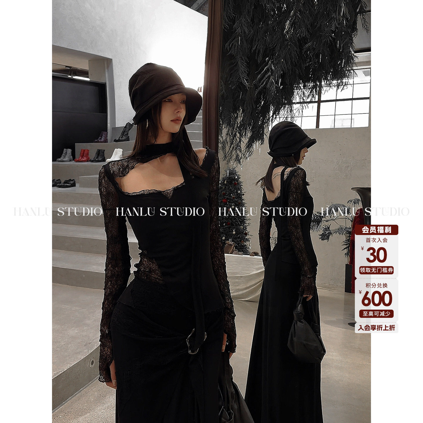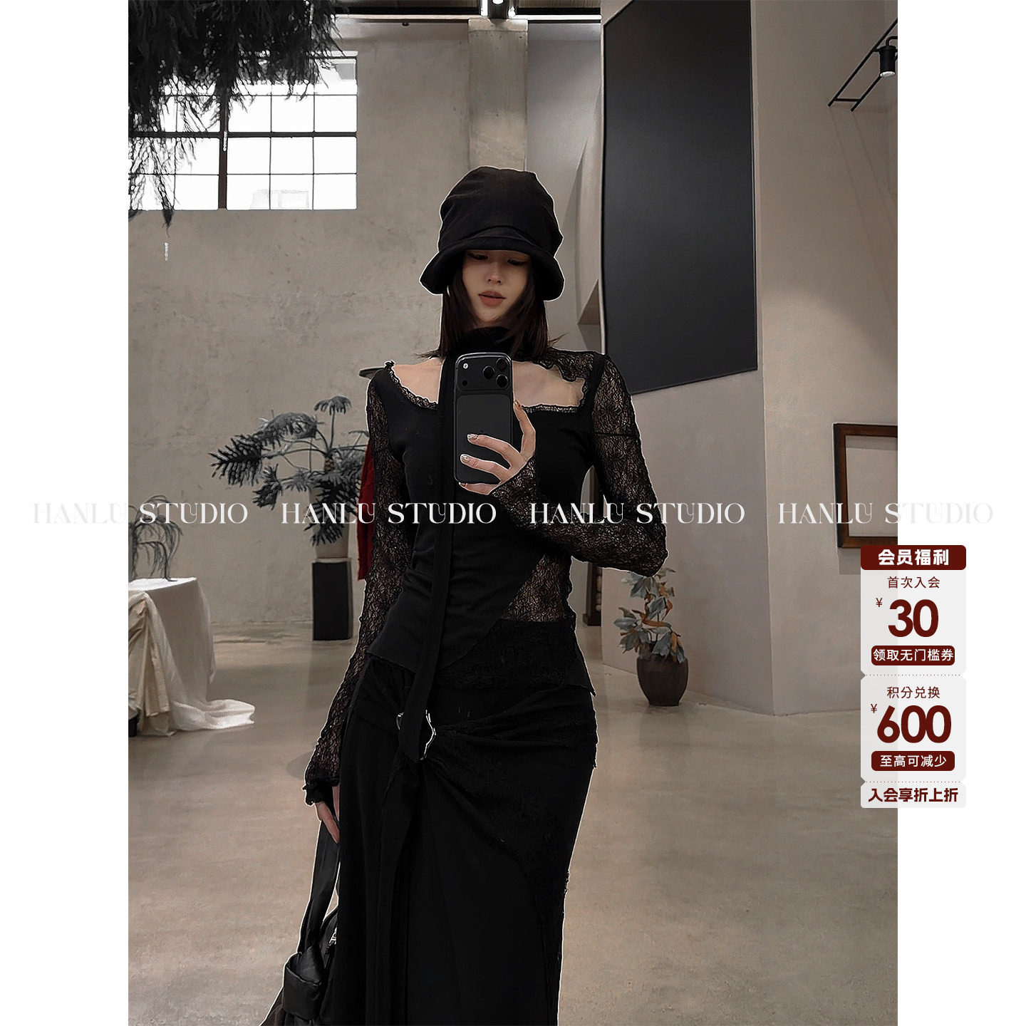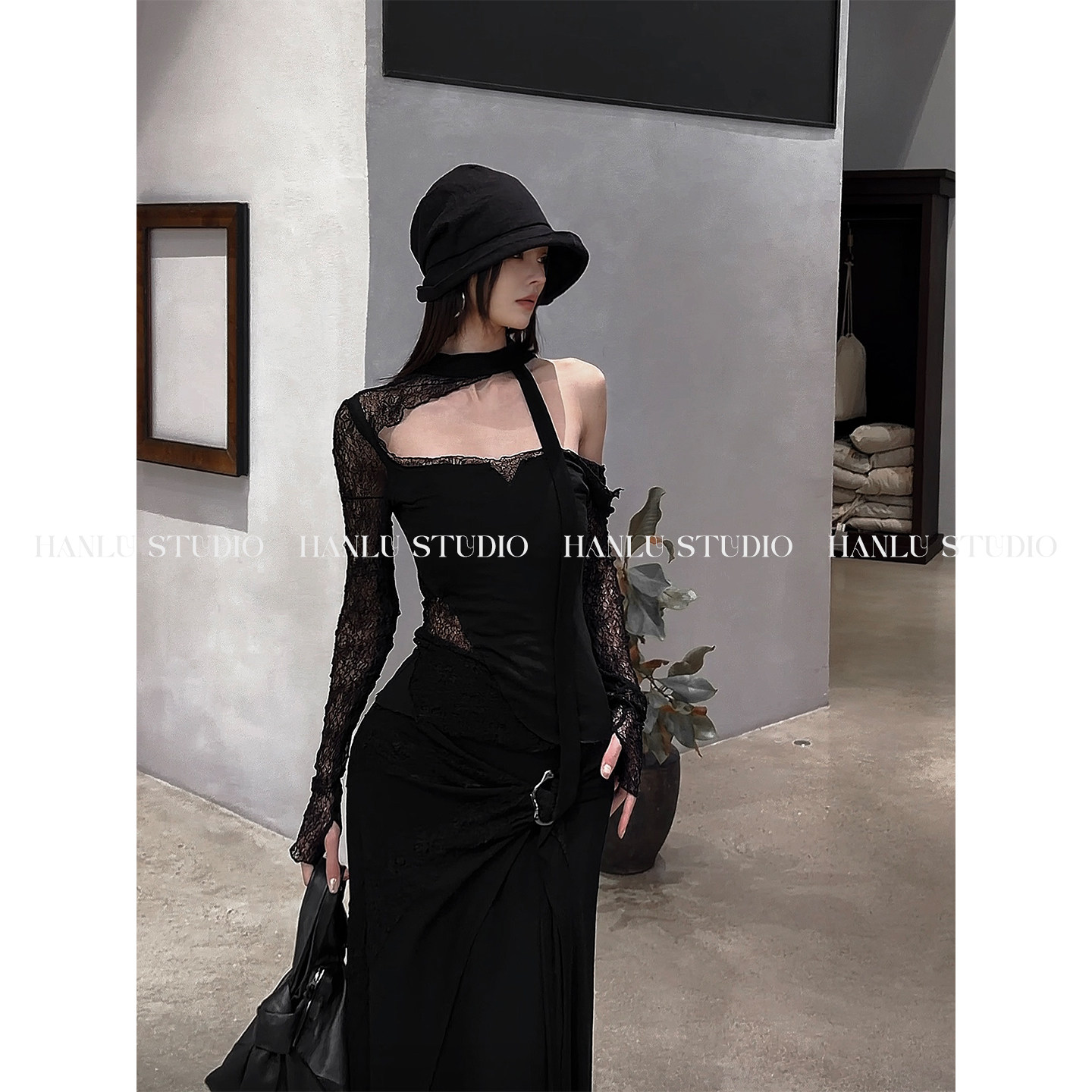 📚 HANLU STUDIO暗黑先锋U领不规则绑带拼接镂空蕾丝羊毛天丝上衣