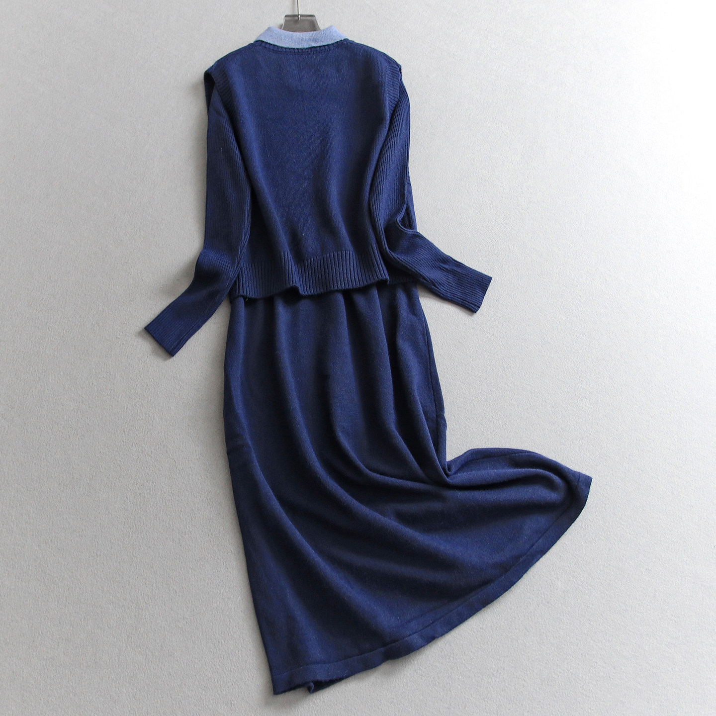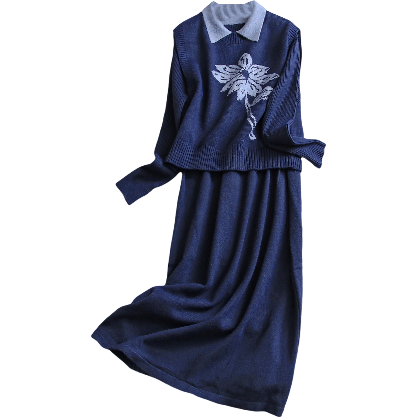 📚 撞色花朵提花叠穿背心裙套装显瘦修身针织毛衣裙长袖女连衣裙Q055