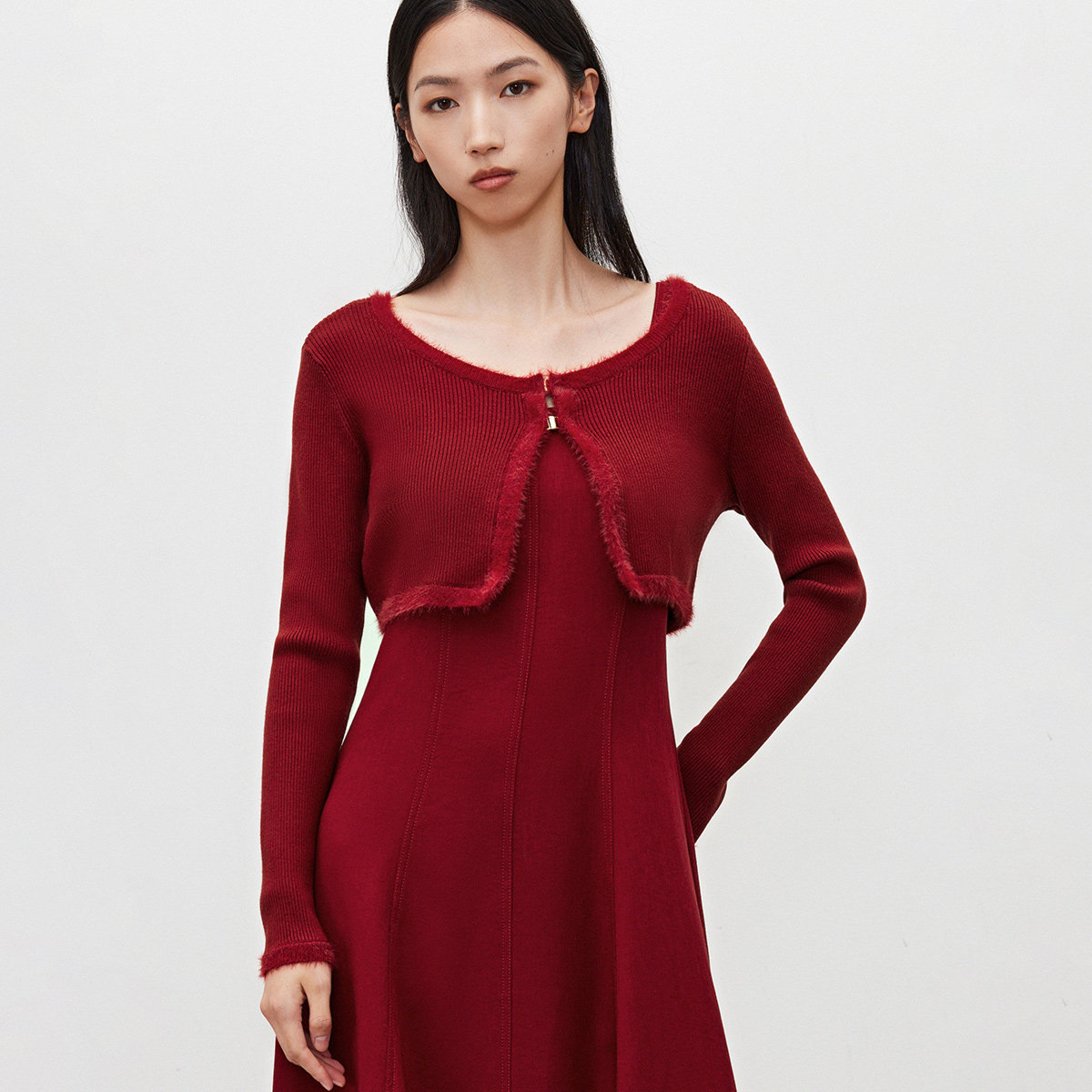 👀首先,从视觉上就让人惊艳不已。这款套装采用了针织U领设计,优雅又时尚,展现出女性独有的气质。A字长款设计,既显瘦又显优雅,非常适合各种身材的女性。