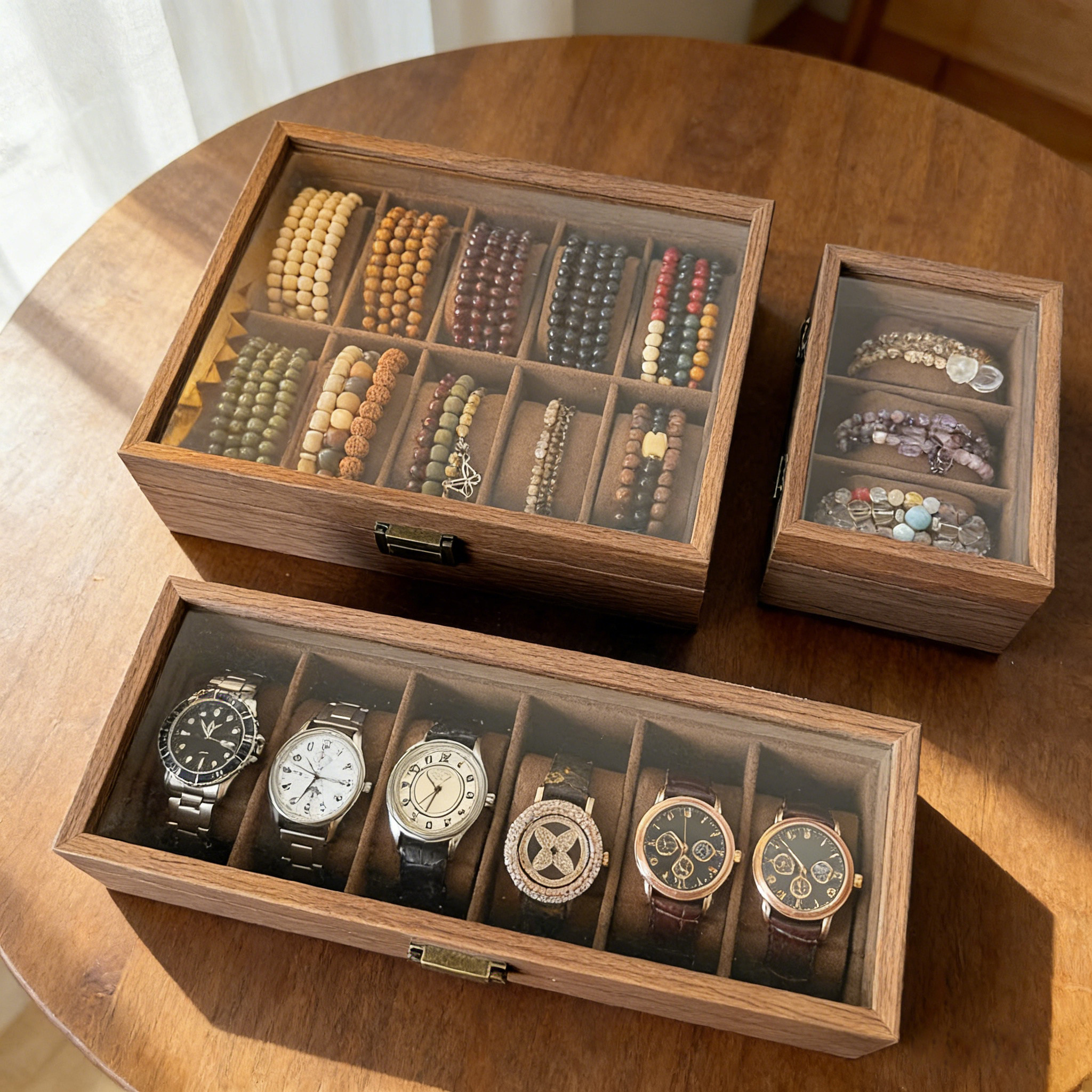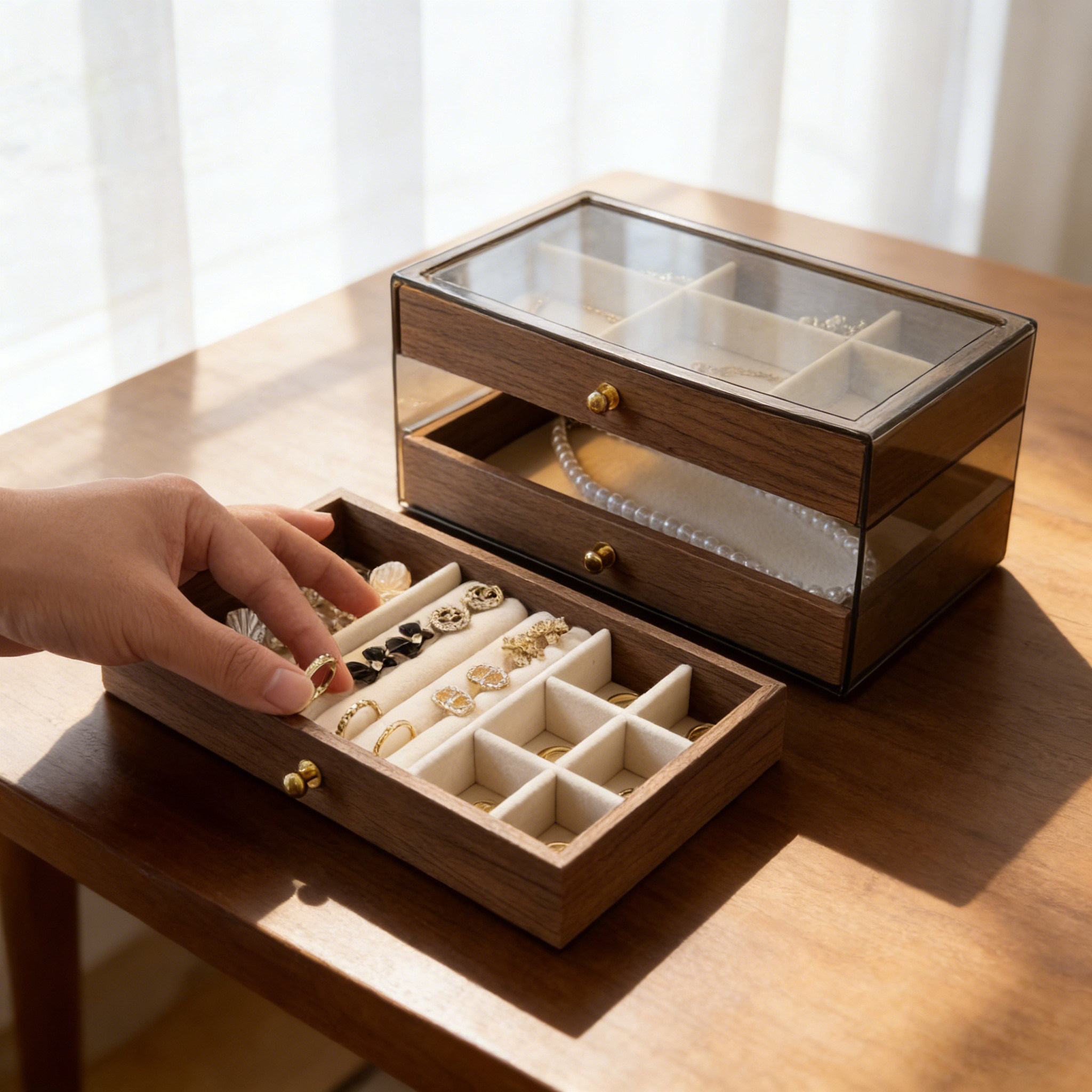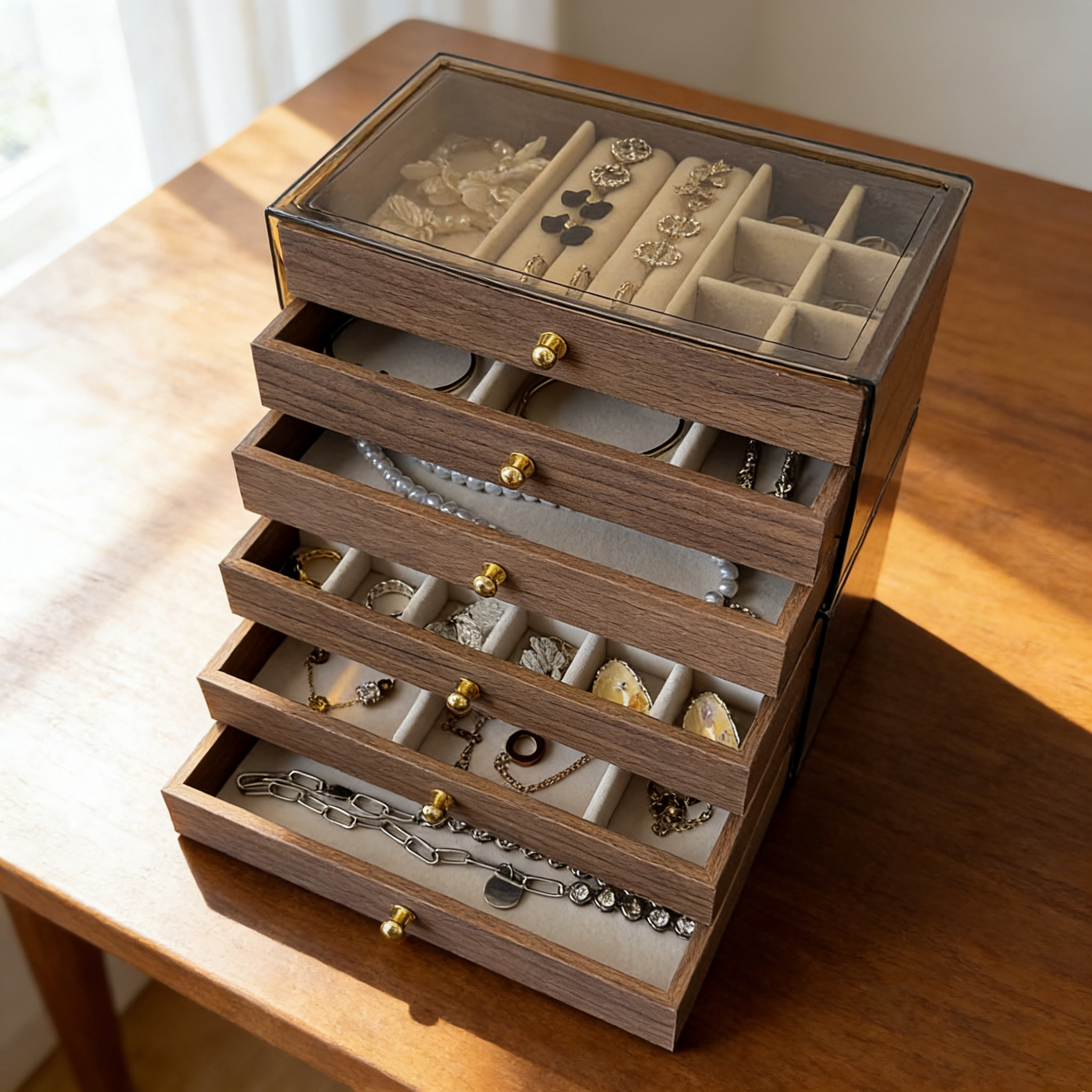 📚 仿木纹高档首饰盒抽屉式轻奢大容量防尘珠宝透明桌面分层收纳盒