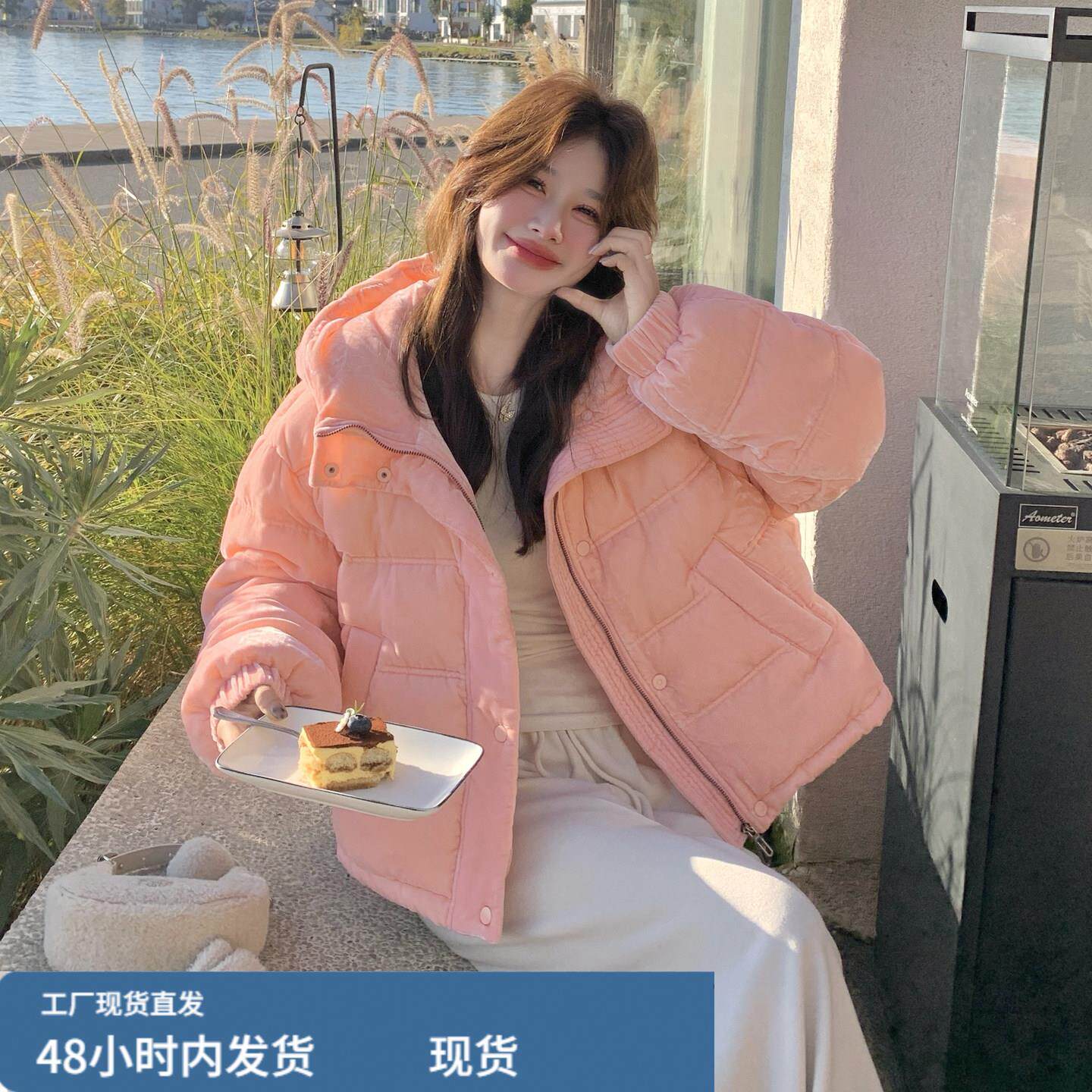 📚 超好看粉色丝绒连帽排骨羽绒服女短款2025冬季甜美减龄面包服外套