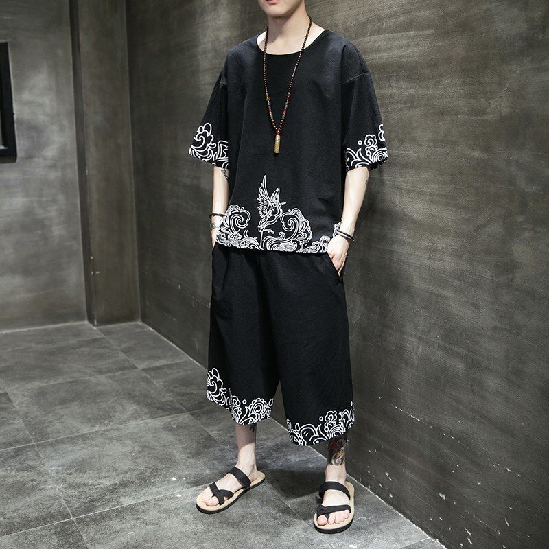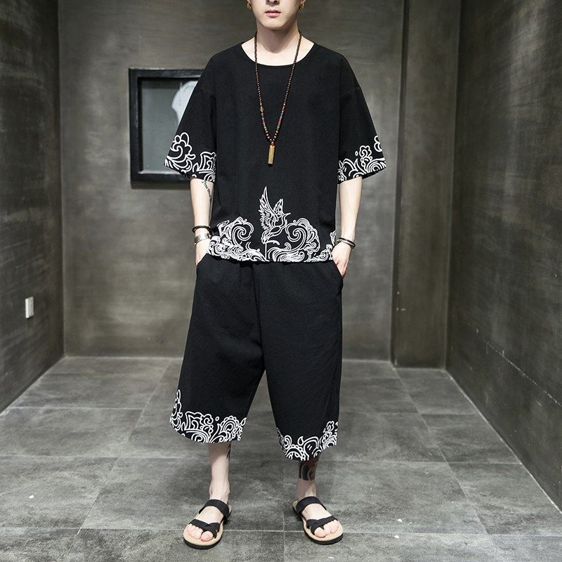 📚 睡衣男夏季宽松大码短袖九分裤棉麻中式亚麻汉服可外穿家居服套装