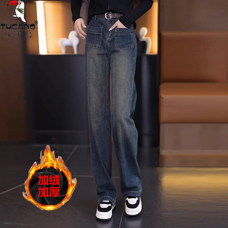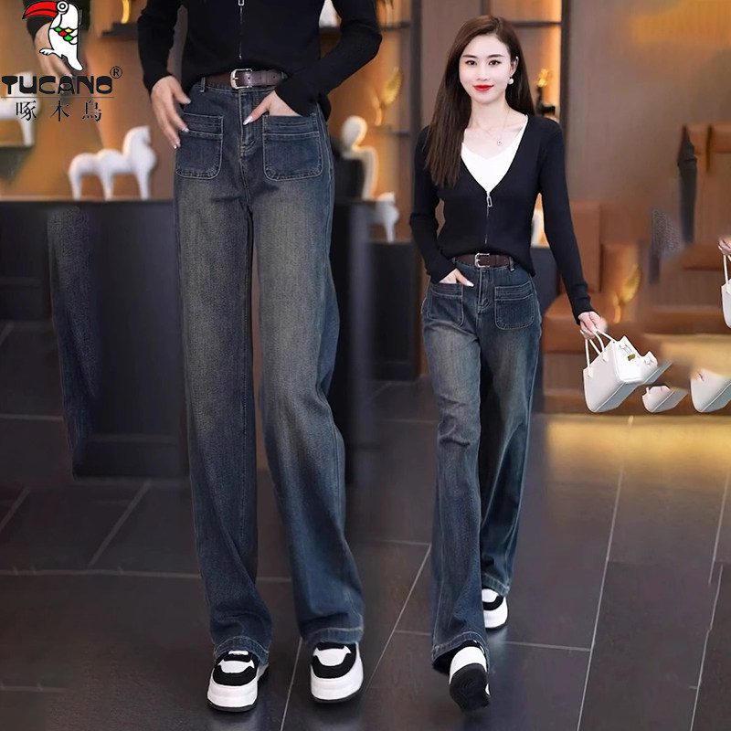 📚 专柜窄版阔腿牛仔裤子女秋冬加绒2025年新款高腰宽松垂感郑州女