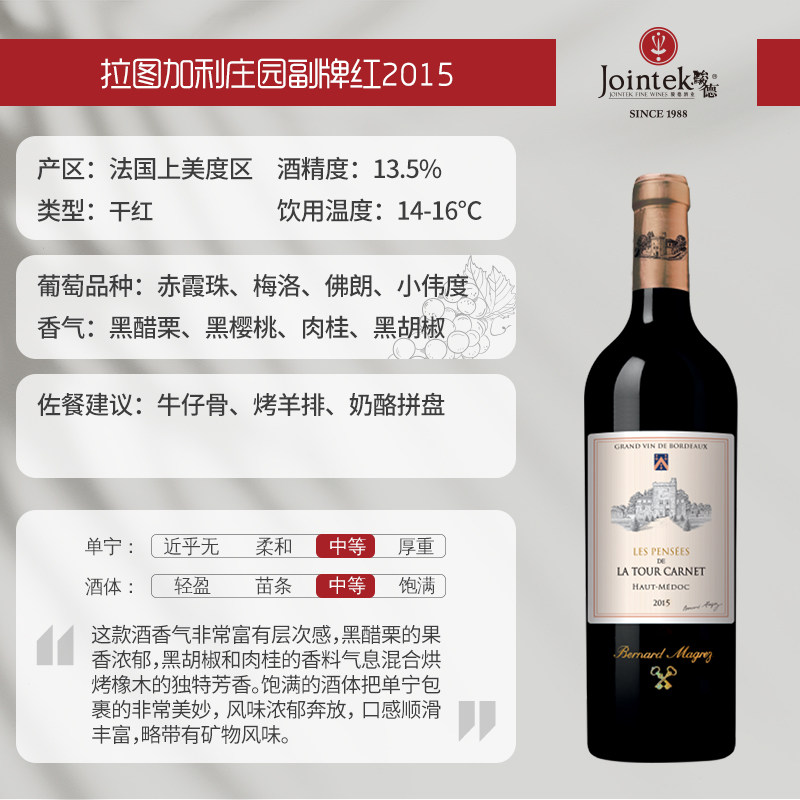 📚 骏德 法国四级副牌原瓶进口 拉图加利副牌红葡萄酒 2015拉图嘉利