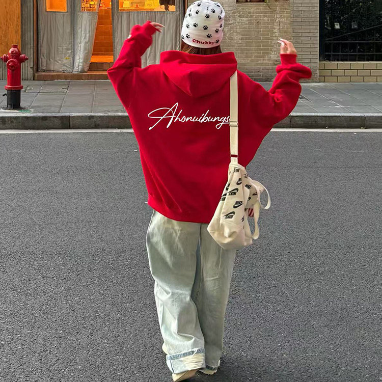 💥掀起风潮!美式高街大红色连帽卫衣女秋冬新装💥