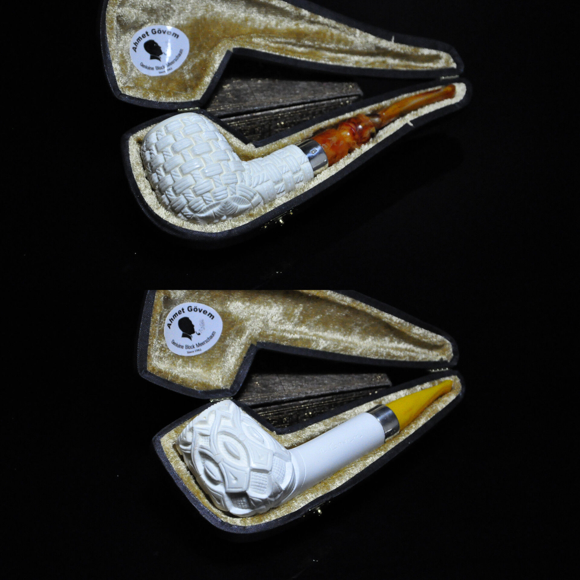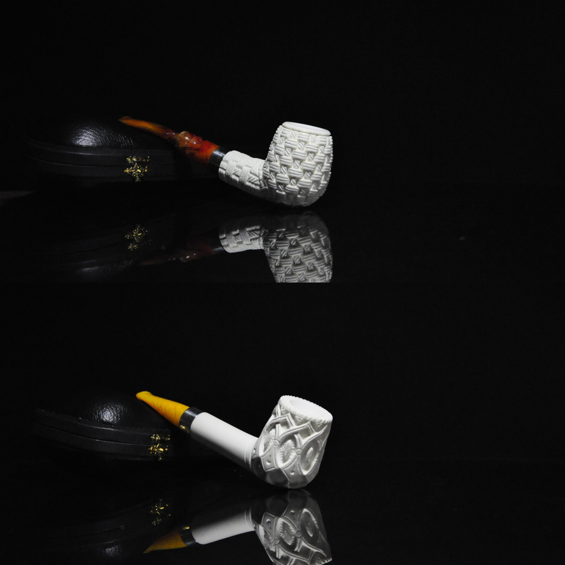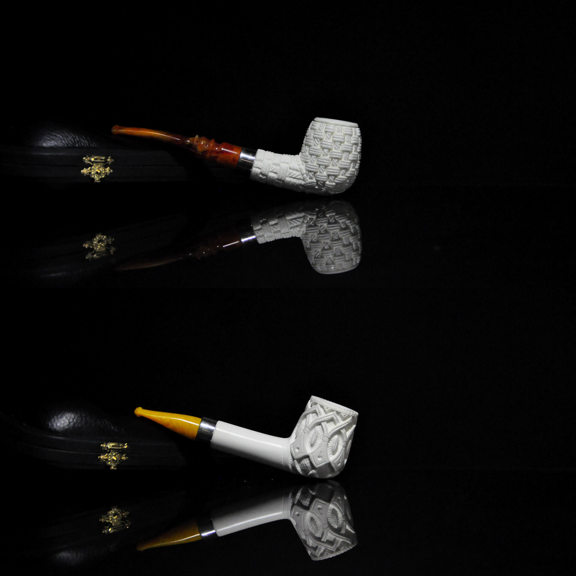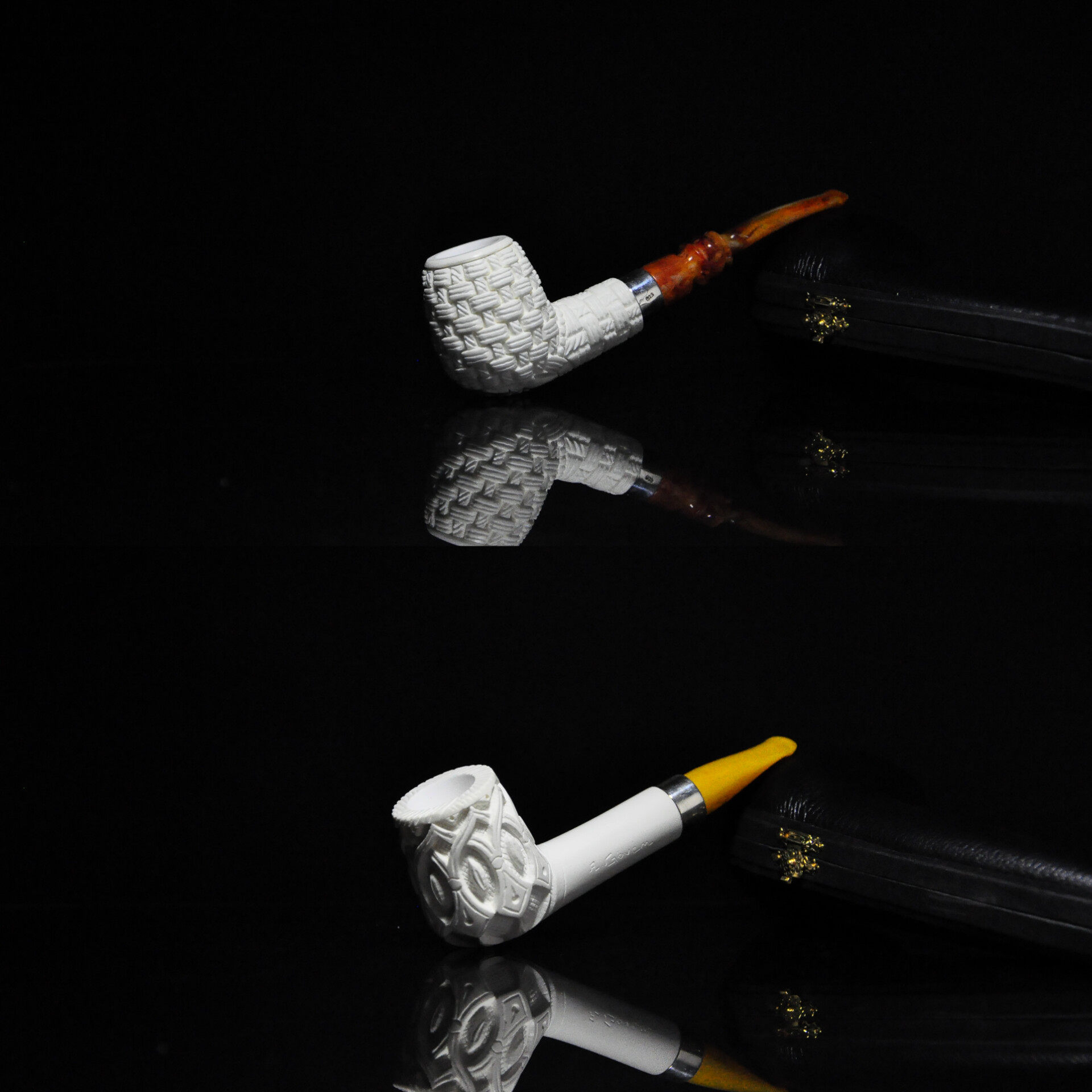 📚 土耳其海泡石烟斗银圈中号白色原石花篮雕刻3㎜烟道收纳盒包邮款