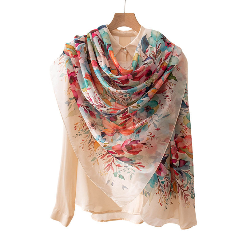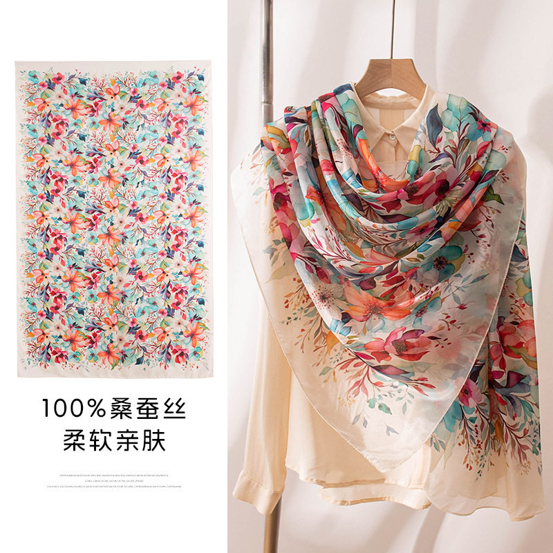 📚 杭州丝绸气质繁花真丝围巾女夏季百搭大长巾桑蚕丝披肩丝巾伴手礼