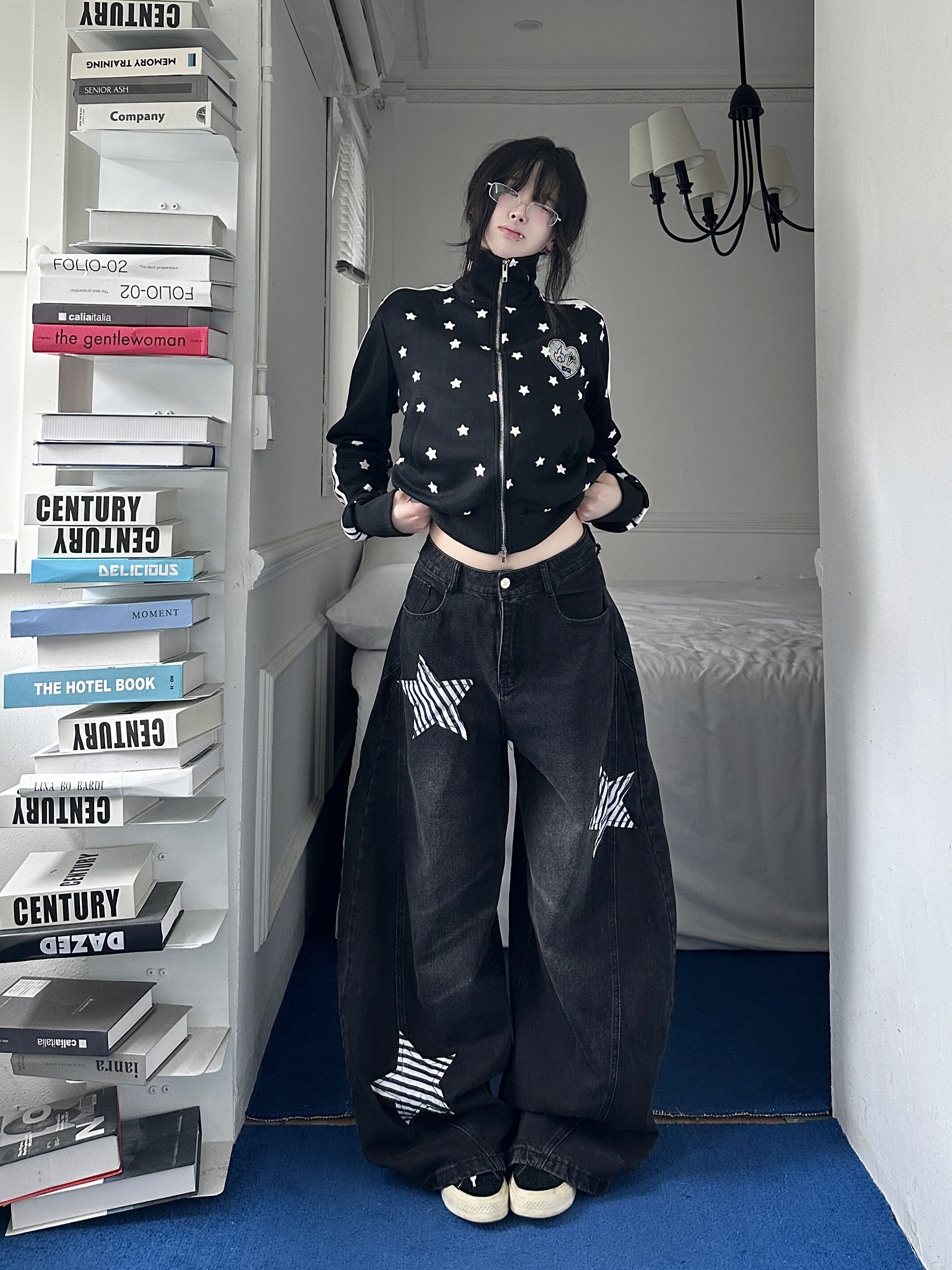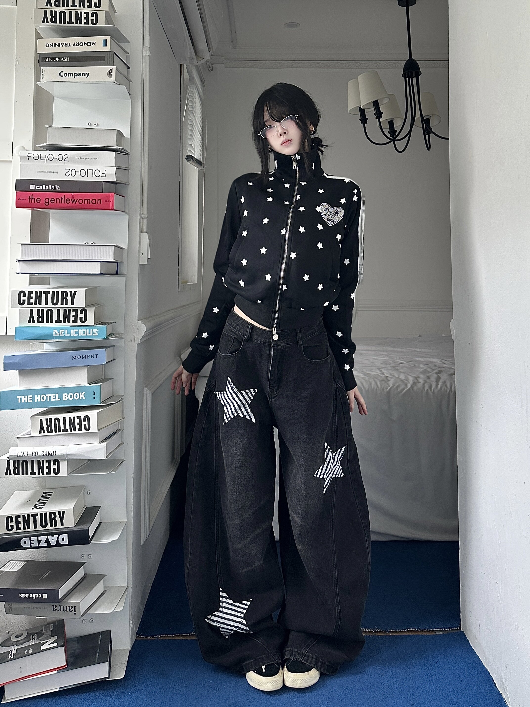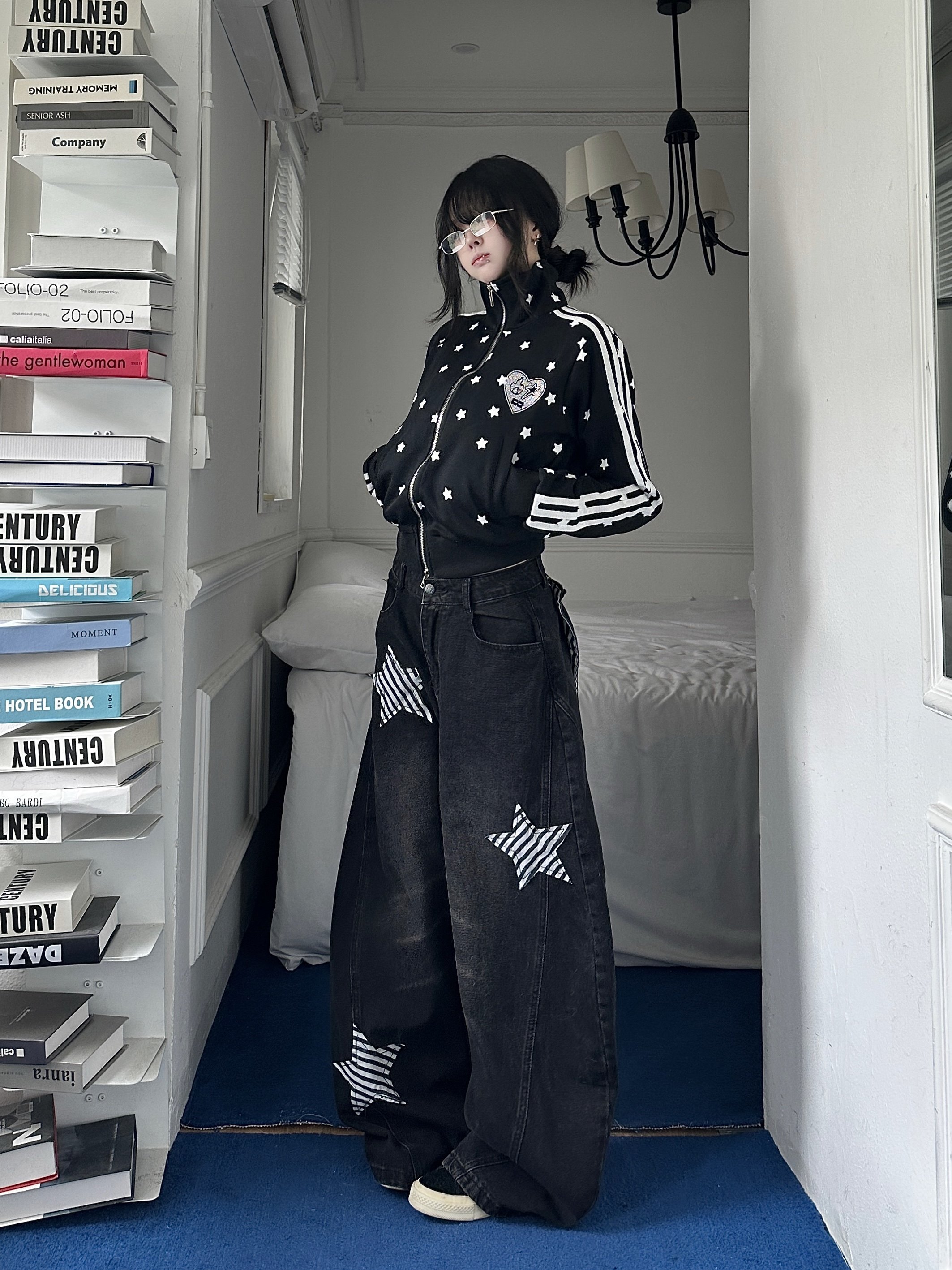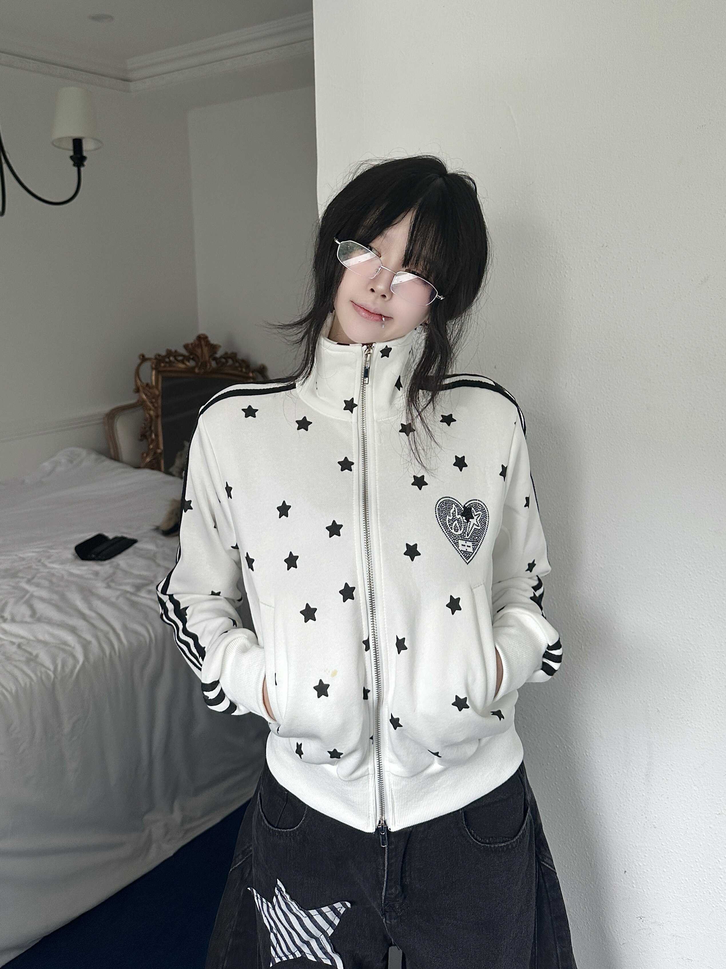📚 咖喱人美式复古满印星星烫钻条纹织带立领短款拉链开衫女秋季外套