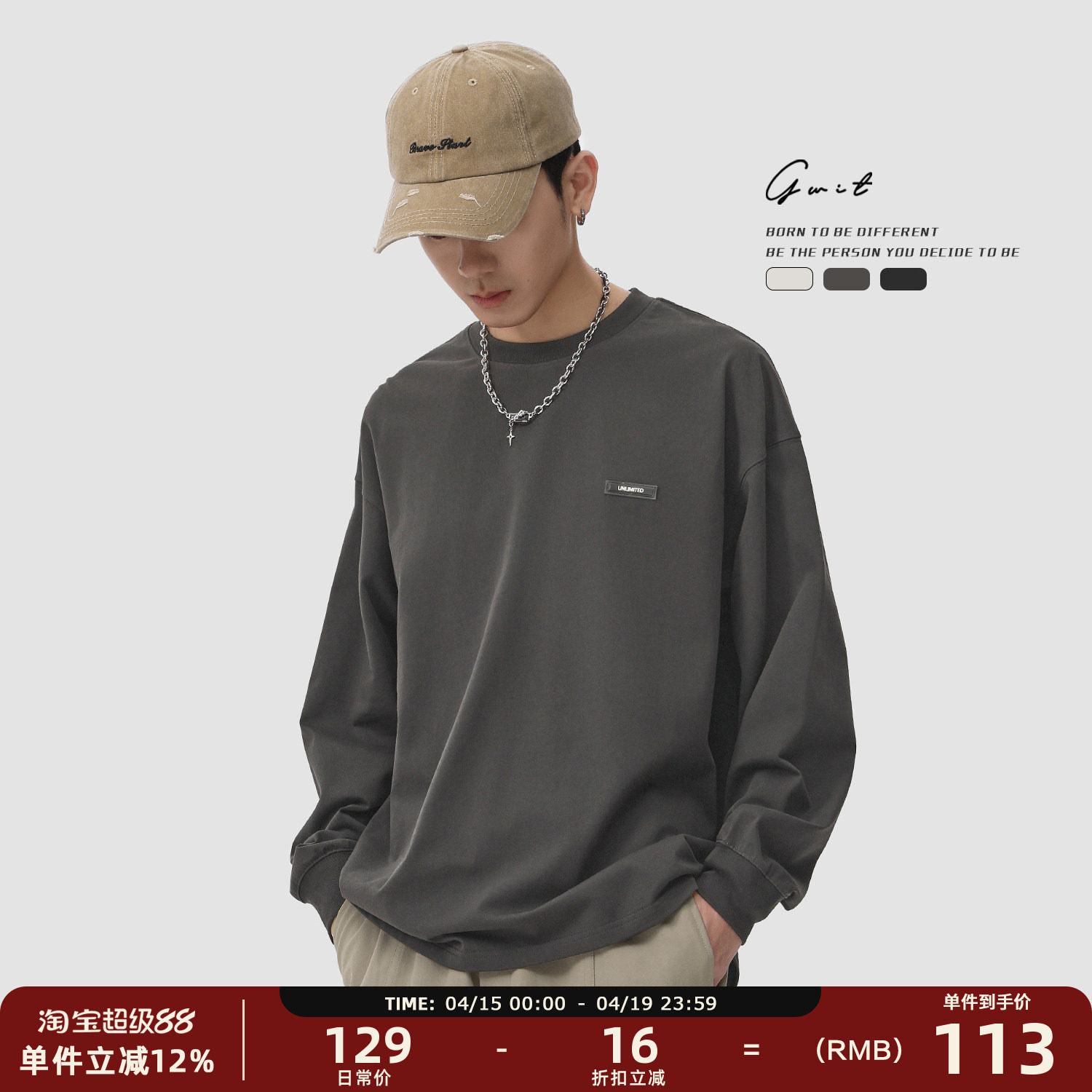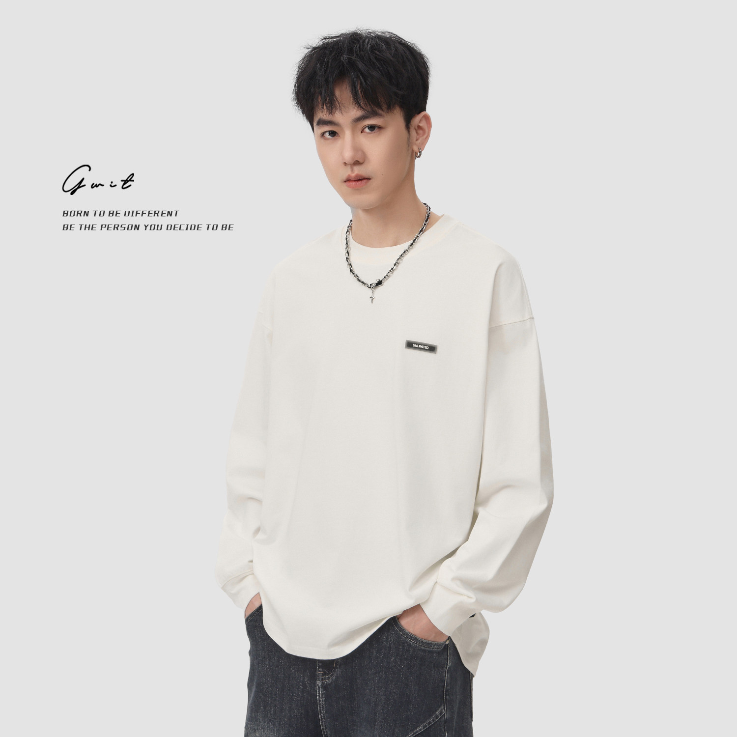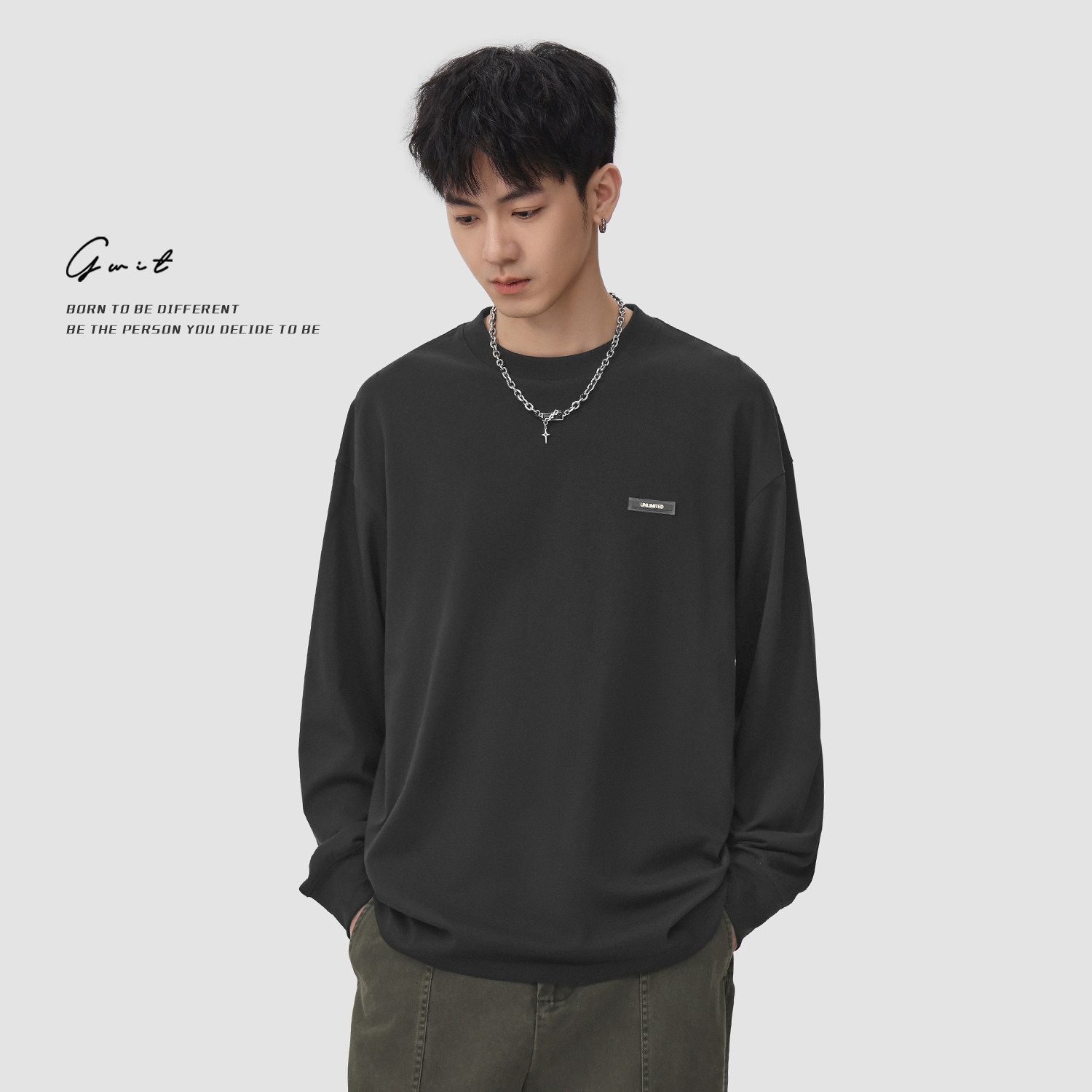 📚 GWIT 320g重磅美式休闲纯棉内搭体恤春秋打底衫圆领纯色长袖T恤男