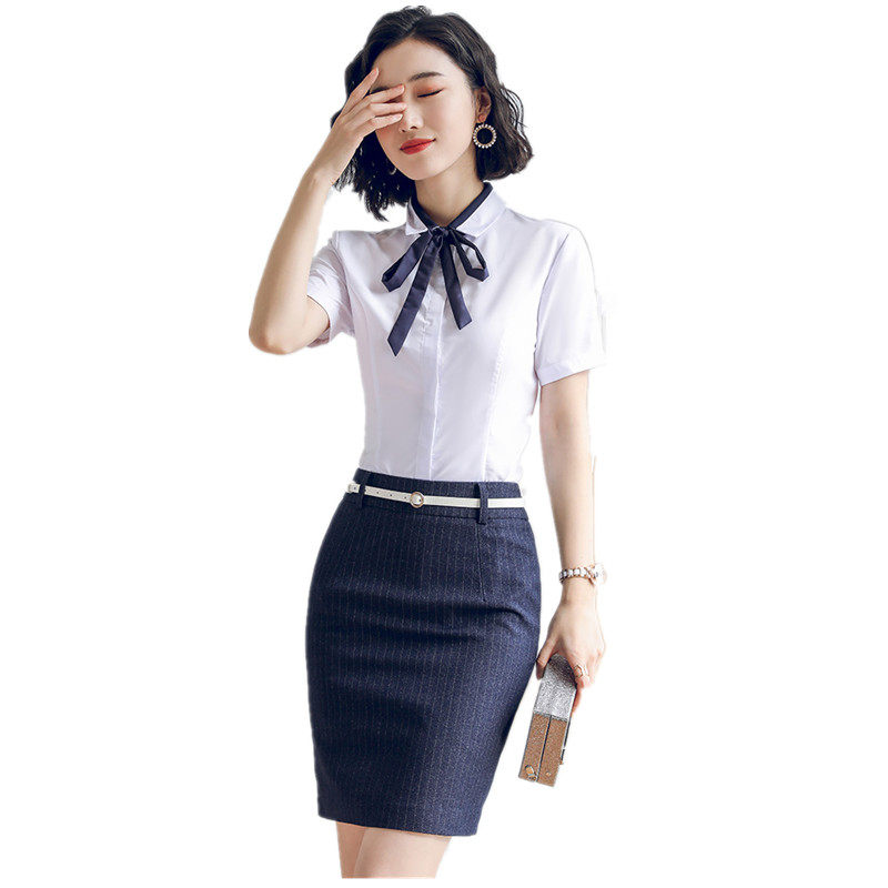 📚 置业顾问女装套装夏季酒店前台工作服售楼部职业白色短袖衬衫套裙