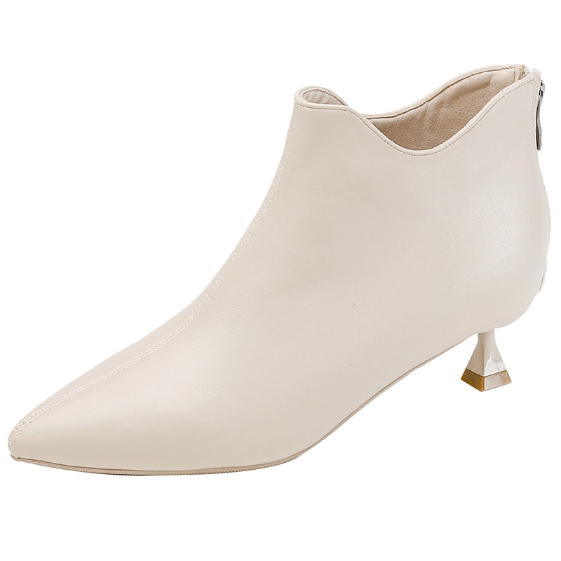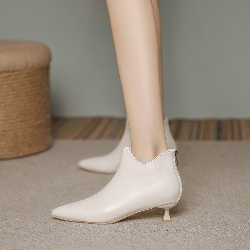 📚 米白色细跟尖头小跟高跟3cm短靴女秋冬新款单靴裸靴工作鞋配裙子